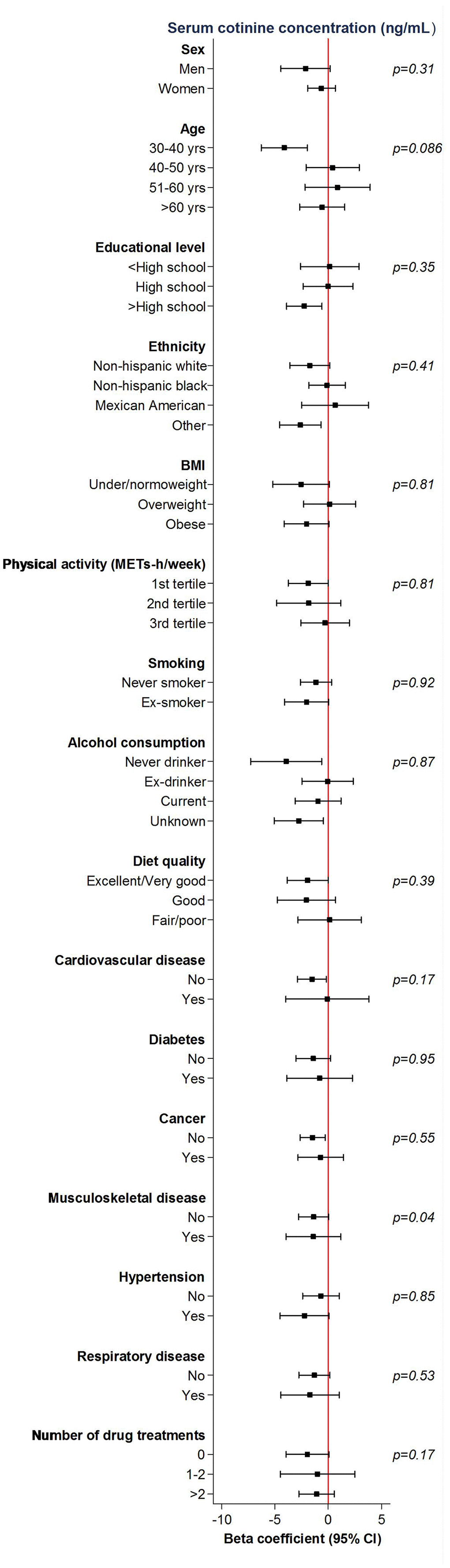 Figure 2 shows results for the highest vs the lowest quartile of serum cotinine across participantʼs characteristics. Although we observed no interactions with age, sex, education, lifestyle factors or BMI, we did observe some effect modification by musculoskeletal disease. In particular, the association was only maintained among individuals without musculoskeletal disease: results for the second, third and highest versus the lowest quartile of cotinine were: -0.58 kg (-2.39- 1.23); -1.89 kg (-3.44, -0.34) and -1.37 kg (-2.80, 0.05); p-trend=0.01.