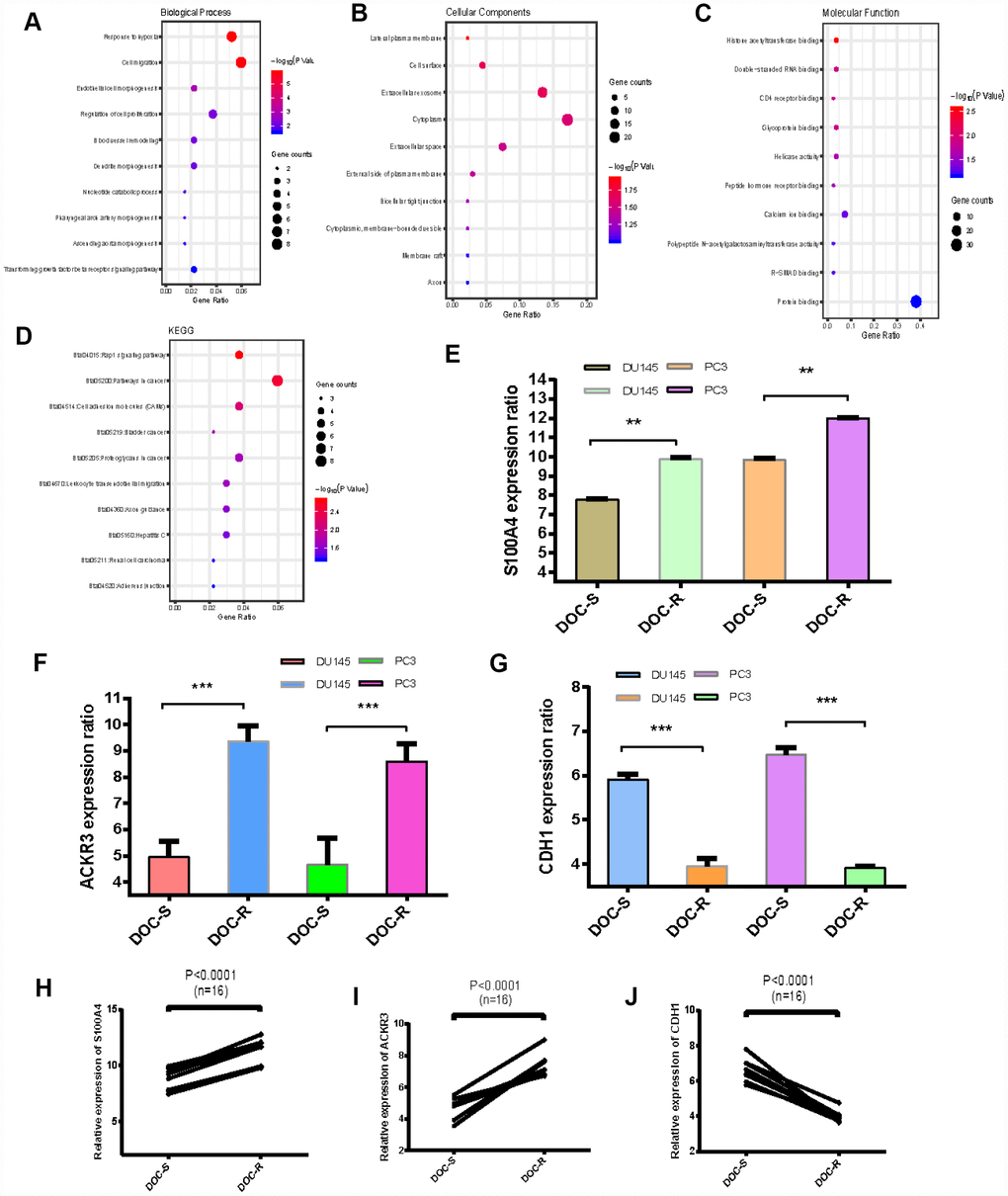 The top five GO biological process terms associated with the overlapping upregulated and downregulated DEGs were involved in the response to hypoxia, cell migration, endothelial cell morphogenesis, regulation of cell proliferation and blood vessel remodeling (Figure 2A). In terms of cellular components, the DEGS were mostly associated with the lateral plasma membrane, cell surface and extracellular exosome (Figure 2B). Molecular function analysis indicated that the overlapping DEGs were mainly enriched in histone acetyltransferase binding, double-stranded RNA binding and CD4 receptor binding (Figure 2C). Subsequent KEGG pathway enrichment analysis revealed that the overlapping DEGs were primarily enriched in the rap1 signaling pathway and pathways involving cancer and cell adhesion molecules (Figure 2D). The top 5 enriched terms are presented in Table 1. These results suggest that the overlapping upregulated genes are mainly enriched in the regulation of cell proliferation and the TGF-signaling pathway, and that expression of S100A4 and ACKR3 is dramatically increased (Figure 2E to 2I). The expression patterns of S100A4 were also evaluated by qRT-PCR in Doc-sensitive (n=6) vs Doc-resistant (n=6) tumor samples from clinical PCa patients [Supplementary Figure 1A] as well as the cells of DU145, DU145R, PC3 and PC3R [Supplementary Figure 1B and 1C]. Results are consistent with the microarray data. The overlapping downregulated genes were mainly associated with regulation of cell migration. CDH1 expression, in particular, was markedly decreased (Figure 2G and 2J).