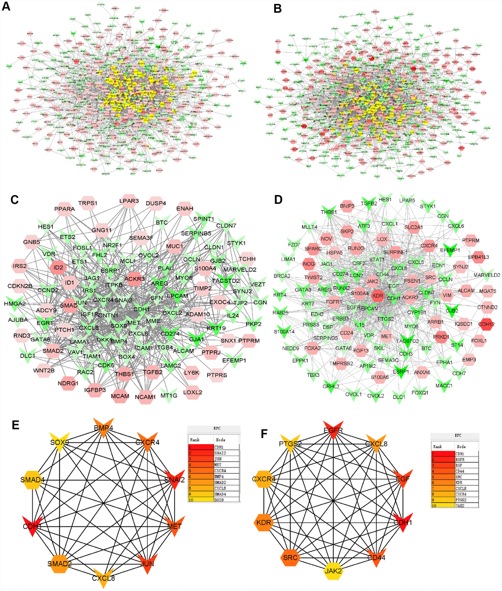 To further identify the core genes contributing to Doc resistance, protein-protein interaction (PPI) networks were generated using significant DU145R and PC3R proteins (Figure 3A and 3B). To characterize the properties of the hub nodes based on analysis of the PPI network, we initially selected first-stage nodes associated with the core proteins S100A4, ACKR3, and CDH1 to identify candidate Doc-resistant PCa markers (Figure 3C and 3D). These consisted of 106 nodes and 556 edges in the DU145R network, and109 nodes and 672edges in the PC3R network. Functional annotation and pathway analysis of the nodes in the two networks are displayed in Table 2. After performing EPC (Edge Percolated Component) and shortest path analyses, the most significant modules composed of 10 nodes were screened out from the PPI networks, and the hub genes in the networks with a connectivity degree >16 were identified (Figure 3E and 3F). Comparison of the hub genes between the two Doc-resistant cell lines revealed CXCL8, CXCR4 and CDH1 to be common to both.
