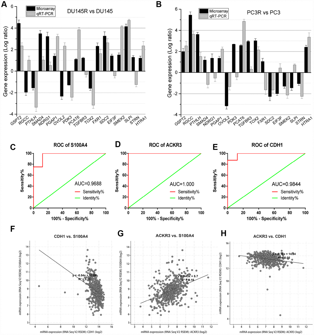 To validate the microarray data, a panel of 18 DEGs randomly selected from DU145R and PC3R cells were compared to their respective controls using qRT-PCR (Figure 4A and 4B). The results showed that most of these genes had transcriptional profiles similar to those revealed in the microarray data. The Pearson correction coefficient between the microarray and qRT-PCR data for the 18 DEGs was 0.87. Thus, the microarray provided a reliable comparison of gene expression between Doc-resistant and Doc-sensitive prostate cancer. Receiver operating characteristic (ROC) analysis was then performed for S100A4, ACKR3, and CDH1. The areas under the ROC curves (AUC) for these three genes all indicated expression values of the microarray analysis for Doc-resistant PCa cell lines. The AUC for S100A4, ACKR3, and CDH1 were 1.000, 0.9688 and 0.9844, respectively (P<0.01, Figure 4C to 4E). Linear correlations among these genes are shown in Figure 4F to 4H. We also used a validation dataset containing 599 patients from TCGA to verify the correlation between the three genes. It showed that there is an inverse correlation between S100A4 and CDH1 expression, but a positive correlation between S100A4 and ACKR3, which is consistent with the analysis of the GSE33455 datasets.