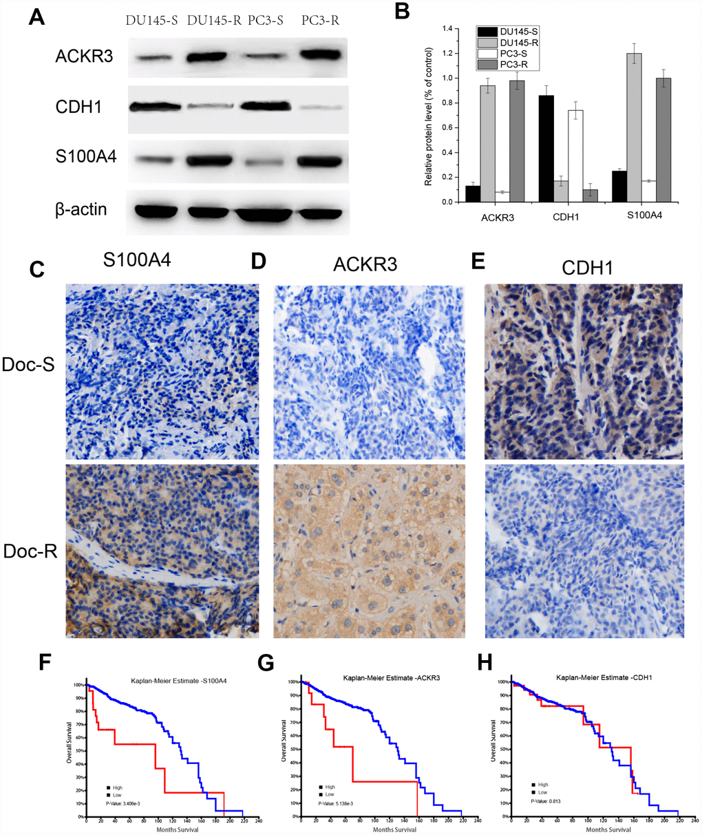 Expression of S100A4, ACKR3, and CDH1 proteins in tumor samples from Doc-resistant and Doc-sensitive PCa patients was detected by western blotting and IHC. Upregulated expression of S100A4 and ACKR3 was detected in Doc-resistant tumor samples (Figure 5A and 5B). The elevated S100A4 and ACKR3 levels were detected predominantly in the cytosol and/or at the plasma membranes of cells in Doc-resistant tumors, while only weak expression of the two proteins was detected in Doc-sensitive tumors (Figure 5C and 5D). On the other hand, CDH1 was markedly downregulated in Doc-resistant tumor samples as compared to Doc-sensitive controls (Figure 5E). In addition, the effect of S100A4, ACKR3, and CDH1 expression on overall survival (OS) was assessed using the TCGA-prostate adenocarcinoma (PRAD) dataset (Figure 5F to 5H). Kaplan-Meier curves compared using log-rank tests showed that patients highly expressing S100A4 or. ACKR3 had significantly shorter OS, whereas the level of CDH1 expression had no significant impact on OS.