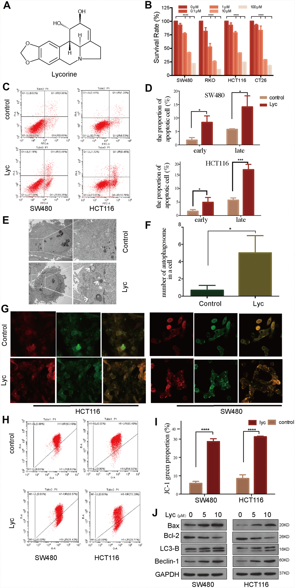The chemical structure of lycorine is shown in Figure 1A. To investigate the cytotoxic effects of lycorine in CRC cells, HCT116, SW480, RKO, and CT26 cells were treated with various concentrations of lycorine for 24 h. Then, the Cell Counting Kit-8 (CCK8) assay was used to assess growth inhibition. The results indicated that lycorine exerted weak effects on CRC cell survival at 0.1–2 μM, whereas a concentration-dependent dramatic decrease in cell viability was observed at 10 μM, with IC50 values of 9.7, 9.07, 6.09, and 3.44 μM in HCT116, RKO, SW480, and CT26 cells, respectively (Figure 1B). Furthermore, the pro-apoptotic effect of lycorine was evidenced by annexin V/PI staining measured using flow cytometry (Figure 1C). The statistical analysis illustrated that lycorine obviously induced late-stage apoptosis in CRC cells (Figure 1D). As one of the crucial mechanisms regulating cell apoptosis during cancer cell progression, autophagy is a double-edged sword in tumorigenesis and anti-cancer therapy [24]. Many anti-tumor agents promote cancer cell apoptosis by inducing cancer cell autophagy [25]. To investigate whether autophagy contributes to lycorine-induced apoptosis in CRC cells, transmission electron microscopy (TEM) was performed, which revealed that the number of inhomogeneous vesicles in the cytoplasm of HCT116 cells after lycorine treatment significantly increased compared with that in the control group (Figure 1E). The statistical results showed that autophagosomes were more numerous in lycorine-treated cells than in control cells (p < 0.01) (Figure 1F). Lycorine-induced autophagic flux was also assessed using LC3-GFP-RFP transfection in CRC cells (SW480 and HCT116) via confocal microscopy (Figure 1G). These results confirmed previous findings that lycorine induced autophagy in certain tumors [9]. Considering the close association between autophagy and dysfunction in mitochondria, we conducted JC-1 tests, and the results revealed that the mitochondrial membrane potential was dramatically decreased after lycorine treatment (Figure 1H, 1I). To further assess the relative changes of apoptosis and autophagy in CRC cells, western blotting was performed to investigate the effects of lycorine on the formation of autophagosomes and induction of apoptosis by evaluating the expression of LC3B-II and Beclin-1, two classical markers of autophagy, and Bax and Bcl-2, two sensitive markers of apoptosis. The results indicated that LC3B-II and Beclin-1 expression and the Bax/Bcl-2 ratio were dramatically increased in response to the indicated concentrations of lycorine (Figure 1J). LC3B-II is considered an index of the number of autophagosomes present in cells [26]. The conversion of LC3B-I to LC3B-II indicates the formation of autophagosomes, and the typical pattern of LC3B-I and LC3B-II is presented in Figure 1J. Collectively, these findings suggest that lycorine has a powerful multi-drug cytotoxic effect on CRC cells; moreover, lycorine-induced apoptosis of CRC cells involves the induction of autophagy.