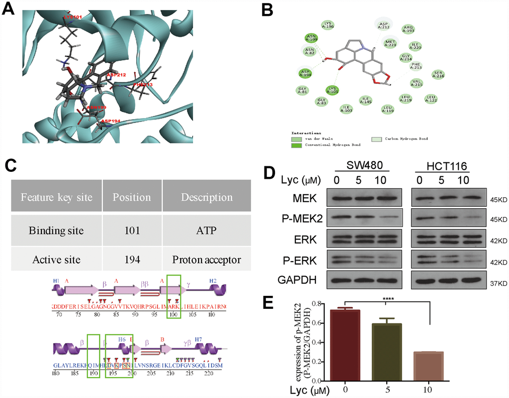 Lycorine has mild ether solubility, i.e., it can pass through cell membranes and bind to certain proteins to induce biological functions [27]. The biological activity of lycorine is strongly associated with its structure; thus, we primarily used SEADOCK and SWISSTARGET software to identify potential targets of lycorine. The results demonstrated that the annotation pathways of lycorine target proteins were mainly enriched in the regulation of the acetylcholine system (AChE and BuChE), G protein-coupled receptor signaling pathway, and positive regulation of the MAPK cascade (Supplementary Table 1). Although the inhibitory effect of lycorine on acetylcholine has been widely studied, few studies have examined its effects on the MAPK pathway, which plays a critical role in cancer development and progression. Therefore, we explored the relationships between lycorine and the core kinases of the MAPK cascade. Then, we further predicted the docking positions and selected the binding pose between lycorine and core kinases of the MAPK pathway via CDOCKER. Notably, the docking model of lycorine with MEK2 ranked the best because it had the lowest binding energy (Figure 2A–2C). The CDOCKER docking result indicated that lycorine can dock with MEK2 based on the accessible pocket formed by the amino acid residues LYS101, ASP194, LYS196, and ASN199.