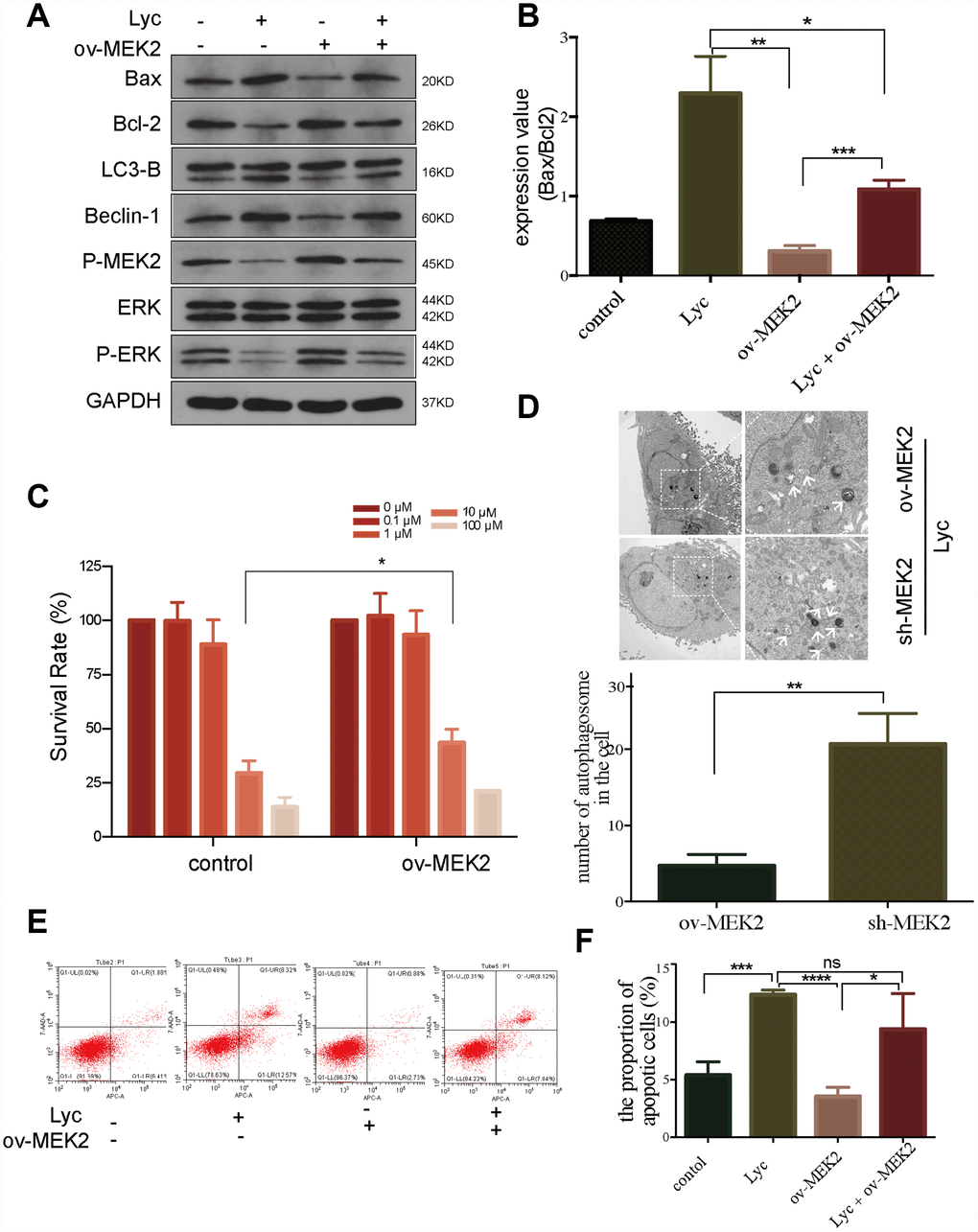 As MEK is an important regulator of autophagy [32], we next evaluated the regulatory effects of lycorine on MEK2 and MEK2-mediated autophagy-associated apoptosis. We overexpressed MEK2 using a GV146-MEK2 recombinant plasmid (Supplementary Figure 1A). Notably, MEK2 overexpression in HCT116 cells abrogated the pro-apoptosis and pro-autophagy effects of lycorine (Figure 3). Western blotting indicated that autophagy and the apoptosis status were elevated following exposure to lycorine in MEK2-overexpressing cells. In addition, the levels of autophagy and apoptosis were higher in control MEK2 cells than in MEK2-overexpressing cells in response to exposure to lycorine (Figure 3A, 3B). Furthermore, the CCK8 assay revealed that the effects of lycorine on cell survival were counteracted by MEK2 overexpression (Figure 3C). Flow cytometry showed that MEK2 overexpression abolishes the pro-apoptosis effect of lycorine (Figure 3E, 3F). These data indicated that targeting MEK2 was required for autophagy-associated apoptosis in response to lycorine.