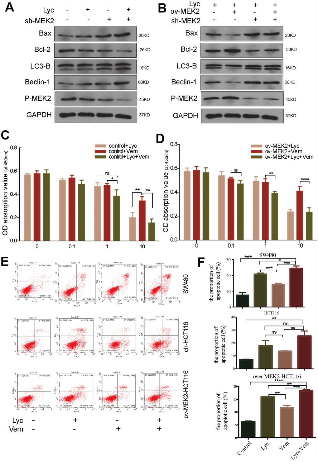 To further clarify the mechanism by which lycorine inhibits MEK2, we precisely reduced MEK2 expression using shRNA in HCT116 cells (Supplementary Figure 1). Next, we examined autophagosomes in MEK2-overexpressing and MEK2-depleted cells under the same lycorine concentration. Using TEM, we found that autophagosomes were obviously increased in number by MEK2 depletion (Figure 3D). Similarly, western blotting confirmed that knockdown of MEK2 facilitated the pro-autophagy and pro-apoptosis effects of lycorine (Figure 4A). We also depleted MEK2 in MEK2-overexpressing HCT116 cells via exposure to lycorine and found that the autophagy and apoptosis levels and p-MEK2 expression were restored compared with our findings in the untreated MEK2-overexpressing HCT116 cells (Figure 4B). Additionally, it is well known that BRAF often acquires gain-of-function mutations that make it constitutively active in CRC, and these constitutively activating signals pass to ERK1/2 through MEK1/2 [22]. Vemurafenib is commonly used in the systematic treatment of BRAF 600-mutated CRC [33]. To examine whether lycorine enhances the inhibitory effect of vemurafenib, control and MEK2-overexpressing cells were cultured for 24 h with the indicated concentrations of vemurafenib combined with lycorine. The CCK-8 assay indicated that lycorine enhanced the activity of vemurafenib (Figure 4C, 4D). We tested the effects of the combination treatment in various CRC cells via flow cytometry. The results demonstrated that MEK2-overexpressing cells might be more sensitive to the combination treatment than control cells (Figure 4E, 4F). Overall, these results strongly indicate that lycorine can enhance the anti-cancer effects of vemurafenib in CRC.