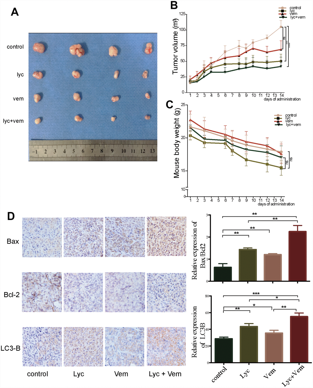After revealing the potential anti-CRC effects of lycorine in vitro, we examined the therapeutic effects of lycorine, vemurafenib, and the combination of lycorine and vemurafenib in vivo using a CRC xenograft nude mouse model. As shown in Figure 5A, the average tumor size was markedly smaller in the lycorine group than in the control group. The combination of lycorine and vemurafenib significantly decreased the average tumor size compared with the effects of vemurafenib alone. An assessment of tumor growth patterns in mice showed that lycorine efficiently inhibited tumor growth from day 7 to day 14 (Figure 5B). The tumor size was significantly decreased after treatment with lycorine alone or in combination with vemurafenib compared with the control group findings on day 14. No significant change in body weight was observed during the treatment period (Figure 5C), indicating that lycorine alone and the combination treatment caused little toxicity. Immunohistochemistry revealed that LC3-B and Bax expression was strongly increased in xenograft tumor tissues, whereas Bcl-2 expression was obviously decreased after treatment (Figure 5D). These findings were consistent with the in vitro results, indicating that lycorine could induce apoptosis and autophagy. Overall, the combination of lycorine and vemurafenib had better anti-cancer effects than either monotherapy, and the potential mechanism is probably related to the induction of autophagy-associated apoptosis.