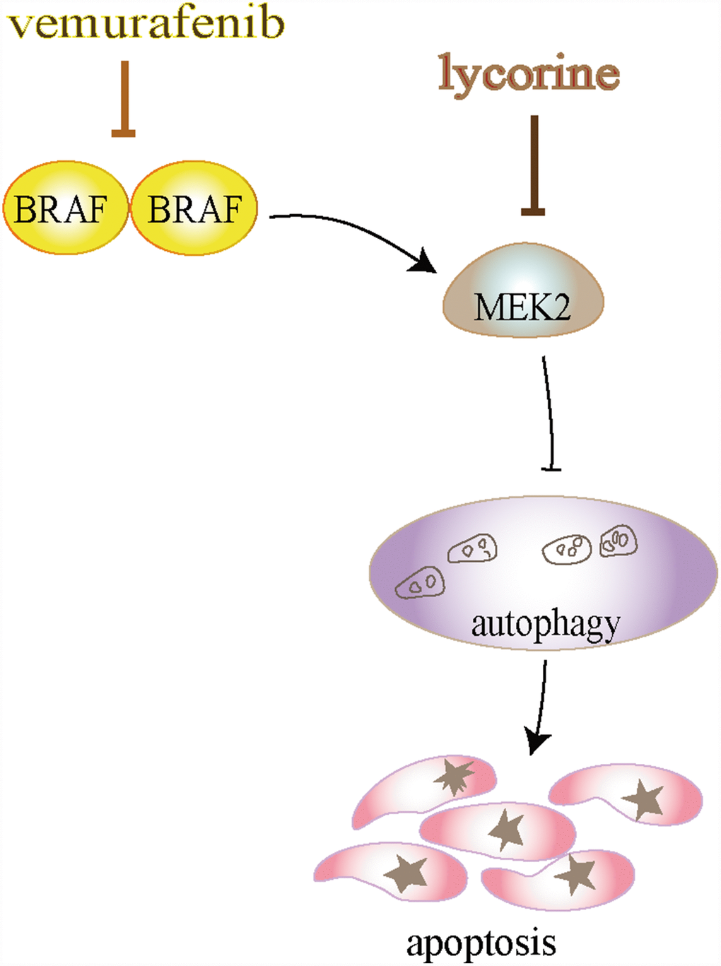 Overall, our study revealed that lycorine induced autophagy-associated apoptosis by targeting MEK2 and demonstrated that lycorine, as a MEK inhibitor, could obviously enhance the effects of the BRAF inhibitor vemurafenib with few side effects.