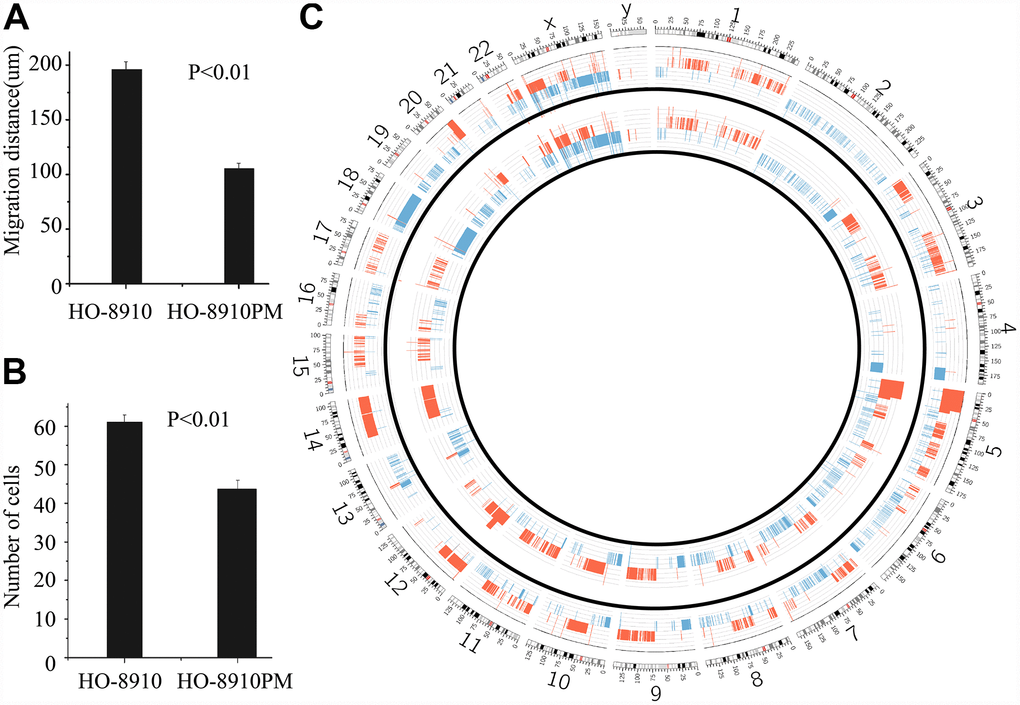 In the HO-8910 versus HO-8910PM comparison, although the CNVs of both HO-8910 and HO-8910PM cells overlapped significantly, large regions differed between the two subclones. Segments of gain at 1p36.11, 1p34.3, 1p33, 1p32.1, 1q23.1, 1q32.3, 2q35, 3p26.2, 5p12, 8q21.13, 10p11.1, 10q23.33, 12q23.1, 12q23.3, 12q24.32, 17q12 and 20q12 appeared only in HO-8910PM cells (named “HO-8910PM-specific gain”), whereas segments of loss at 1p36.13, 1p13.3, 1q25.1, 2q22.3, 2q23.1, 2q24.2, 4q12, 5p12, 5q31.3, 6q16.2, 8q22.1, 8q24.11, 10p12.32, 10p12.1, 10p11.23, 10q26.11, 13q21.31, 14q11.2, 14q13.1 and 21q21.1 appeared only in HO-8910PM cells (named “HO-8910PM-specific loss”). The CNV profiles are shown in Figure 2C.