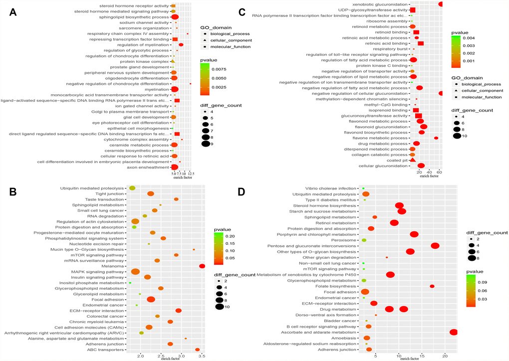 Functional analysis by the Database for Annotation, Visualization and Integrated Discovery (DAVID) indicated that the proteins encoded by the “HO-8910PM-specific gain” genes (479 genes) are involved in the negative regulation of chondrocyte differentiation, respiratory chain complex IV assembly, myelination, the regulation of myelination, axon ensheathment and other processes (Figure 3A). A total of 479 “HO-8910PM-specific gain” genes were uploaded into the Kyoto Encyclopedia of Genes and Genomes (KEGG) database to conduct KEGG analysis. The significantly enriched KEGG terms were pathways in melanoma, the ECM-receptor interaction, focal adhesion, ABC transporters, adherens junctions, and others (Figure 3B). The proteins encoded by the “HO-8910PM-specific loss” genes (400 genes) displayed significant enrichment for xenobiotic glucuronidation, the negative regulation of cellular glucuronidation, flavonoid glucuronidation, glucuronosyl-transferase activity, cellular glucuronidation, and other terms (Figure 3C). The 400 genes were uploaded for KEGG analysis. The significantly enriched KEGG terms were pathways in ascorbate and aldarate metabolism, pentose and glucuronate interconversions, porphyrin and chlorophyll metabolism, other types of O-glycan biosynthesis, drug metabolism, and other terms (Figure 3D).