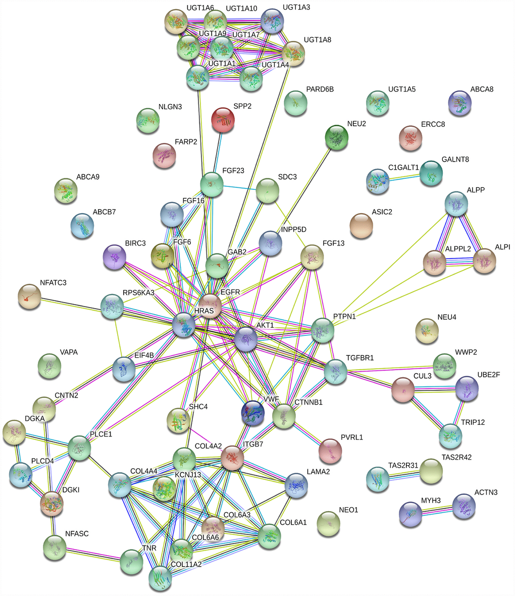 Among the “HO-8910PM-specific gain” and “HO-8910PM-specific loss” genes enriched in the KEGG database (p>0.05), 71 were shared. To obtain protein interaction data, a human PPI dataset from the Search Tool for the Retrieval of Interacting Genes (STRING) database was applied to the 71 genes. The MCODE algorithm in Cytoscape was used to identify highly interconnected regions or regions of high density in the network. In total, 54 nodes and 112 edges occurred in the PPI network. GAB2 [22], AKT1 [23], EGFR [24], CTNNB1 [25], HRAS [26], ITGB7 [27], COL6A1 [28], COL6A3 [29], UGT1A1 [30], UGT1A10 [31], UGT1A3 [32], UGT1A4 [33], UGT1A6 [34], UGT1A7 [35], UGT1A8 [36], and UGT1A9 [37] were the top 16 genes with the highest connectivity degree (Figure 4).
