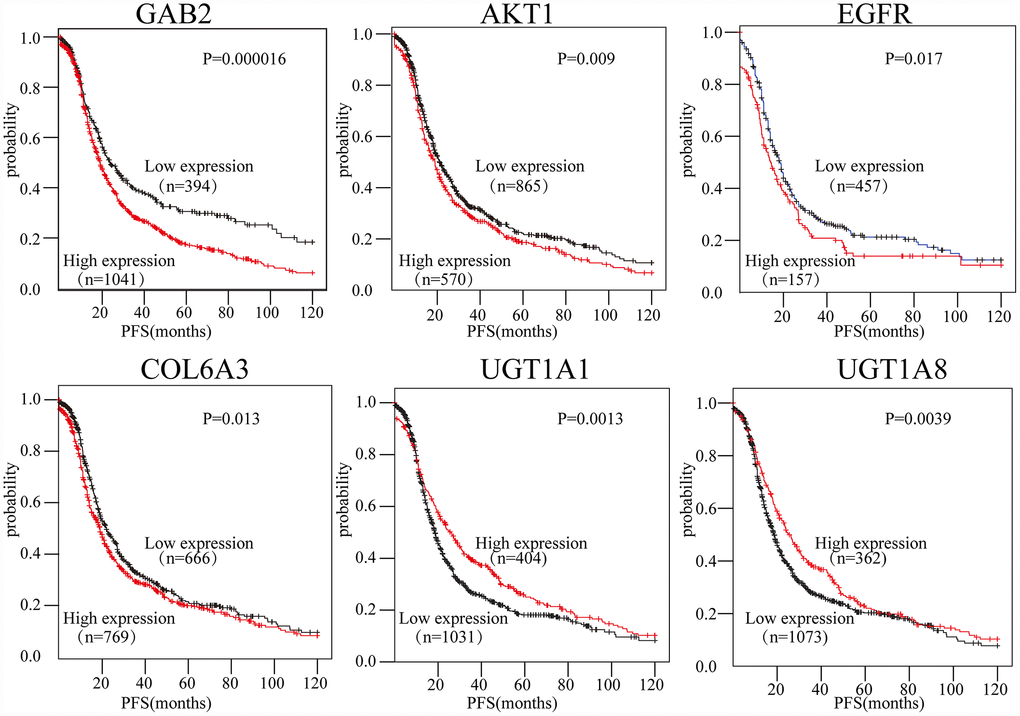 To evaluate the prognostic values of the 16-gene signature selected by the PPI, the Kaplan-Meier plotter (KM plotter) was applied. Progression-free survival (PFS) for patients with OC was determined according to the low and high expression of the hub genes. The results showed that high GAB2, AKT1, EGFR, and COL6A3 expression were associated with poor PFS for OC patients (P<0.05). Additionally, high UGT1A1 and UGT1A8 expression were associated with improved PFS for OC patients (P<0.05) (Figure 5). However, the results also showed that the expression levels of CTNNB1, HRAS, ITGB7, COL6A1, UGT1A10, UGT1A3, UGT1A4, UGT1A6, UGT1A7, and UGT1A9 did not correlate with PFS (P>0.05).