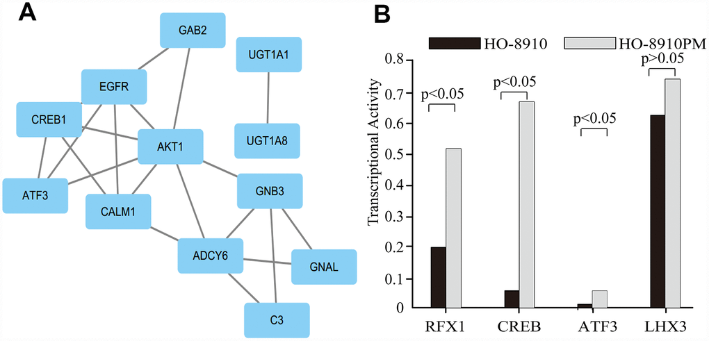 Four candidate gene-related TFs associated with OC, namely, RFX1, ATF3, CREB, and LHX3, were predicted with a PASTAA analysis (p<0.01). The TF-target gene regulatory network was constructed by introducing the TF and target gene into Cytoscape software (Figure 6A). Relative to the corresponding expression in HO-8910 cells, RFX1, ATF3, and CREB, of a total 345 candidate TFs, were upregulated extensively in HO-8910PM cells, but there was no significant difference in LHX3 expression between the two cell lines (Figure 6B).