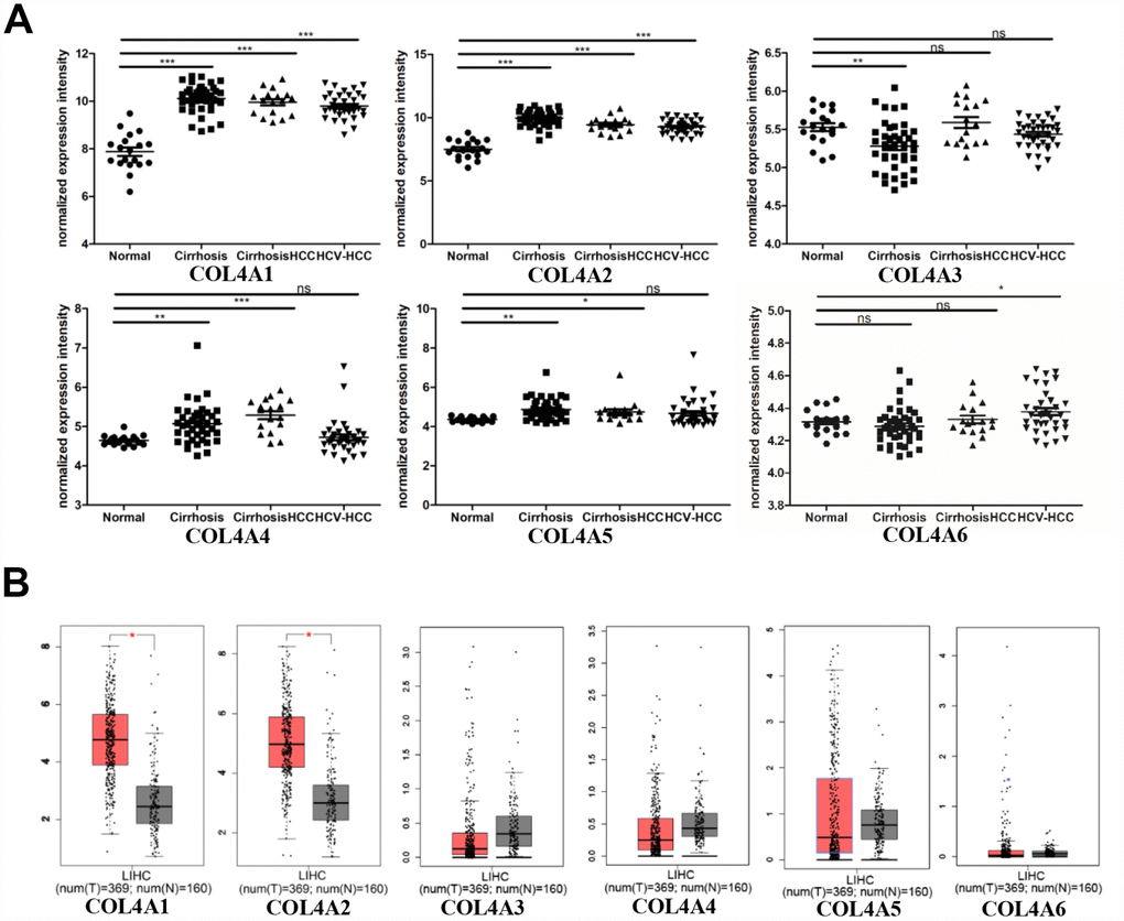 The expression profile of six COL IV isoforms in HCC was further examined by using GEPIA database. GEPIA web provides a server to analyze the gene expression profiling between cancer and normal tissues [64]. The significance test method was one-way ANOVA, using disease state (Tumor or Normal) as variable for calculating differential expression.