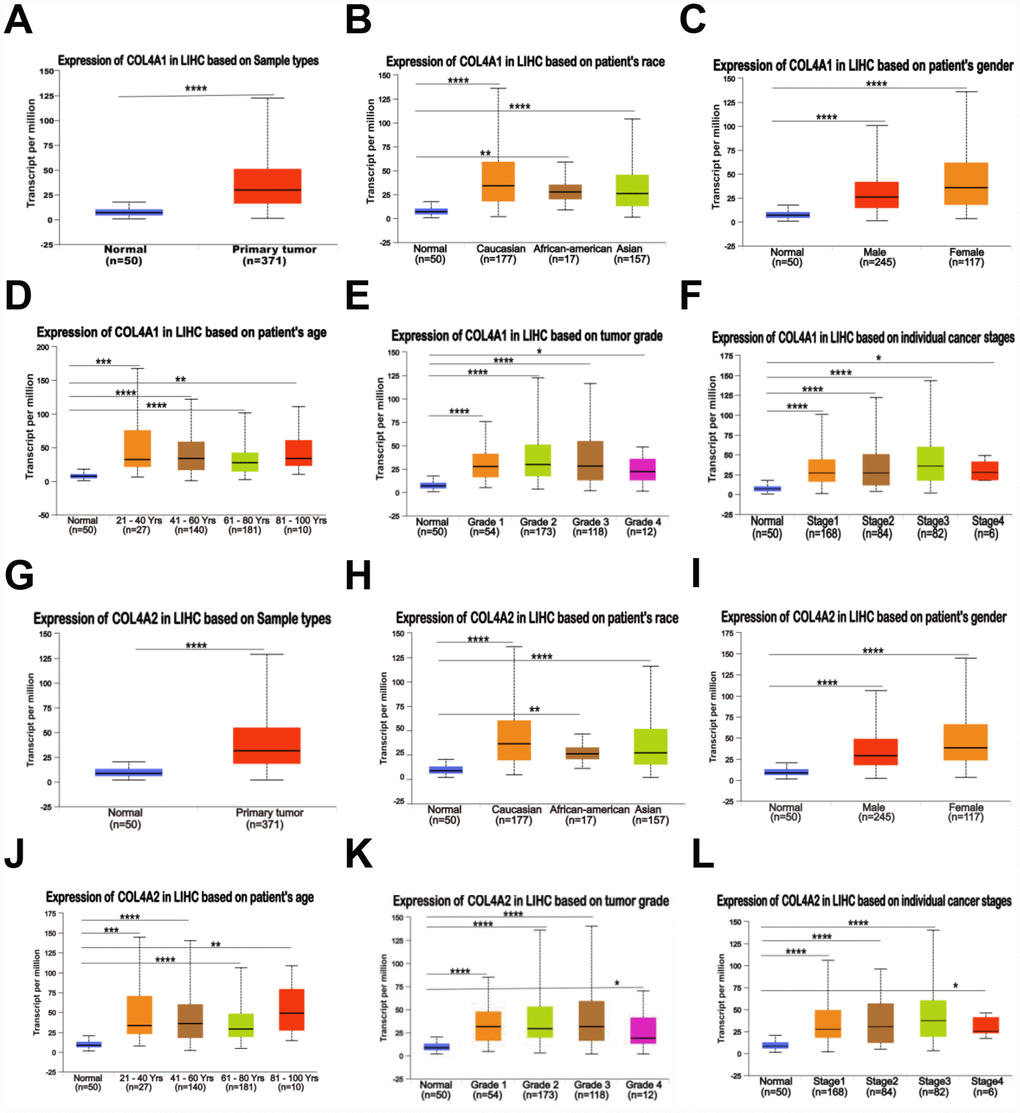 The relationship between the mRNA levels of COL4A1/COL4A2 and the pathological clinic features of patients with HCC on ethnicity, gender, age, tumor grade, and disease stages was analyzed by using UALCAN. UALCAN (http://ualcan.path.uab.edu) is a web portal to facilitate gene expression analysis of cancer subgroups and cancer survival analyses [63]. The mRNA levels of COL4A1 and COL4A2 in HCC samples were compared with that in the normal tissues. P ˂ 0.05 were considered different significantly (*, P < 0.05, **, P < 0.01, ***, P < 0.001, ****, P < 0.0001). Student’s t-test was performed to generate a p-value.