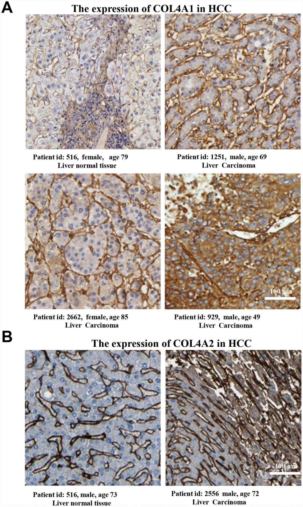 Six COL IV isoforms (COL4As) have been identified in mammalian cells. We initially assessed the transcriptional levels of COL4As in multiple HCC studies from GEO and TCGA databases. The mRNA expression levels of COL4A1 and COL4A2 were significantly upregulated in patients with liver cirrhosis and HCC tissues in two datasets. In the Mas Liver (GSE14323), COL4A1 was overexpressed in liver cirrhosis (fold change = 4.233, p = 2.78E-13) and HCC (fold change =3.759, p = 1.40E-12), while COL4A2 was higher expressed in liver cirrhosis (fold change = 2.487, p = 7.88E-14) and HCC (fold change =3.492, p = 1.01E-10) versus normal tissues (Figure 1A and Supplementary Figure 1B). In the Wurmbach liver (GSE6764), COL4A1 was increased in cirrhosis (fold change =2.997, p = 7.24E-6), liver cell dysplasia (fold change =2.140, p = 7.46E-6), and HCC (fold change =3.711, p = 1.16E-10). COL4A2 was also increased in cirrhosis (fold change =3.412, p = 2.02E-6), liver cell dysplasia (fold change =2.223, p = 1.35E-4), and HCC (fold change =3.154, p = 7.07E-7) compared to normal tissues (Supplementary Figure 1A and 1C). Apart from this, COL4A1 and COL4A2 were in the top 5% over-expression gene rank of liver cirrhosis and HCC in both datasets (Supplementary Figure 1B, 1C). In comparison, COL4A3-COL4A6 were not significantly changed in HCC versus normal tissues (Figure 1A and Supplementary Figure 1A). Further analysis of 371 HCC patients in TCGA consistently showed different effects of COL4A1-COL4A6 in hepatocarcinogenesis (Figure 1B). Moreover, the mRNA levels of both COL4A1 and COL4A2 were significantly increased in subgroups of HCC patients classified by ethnicity, gender, age, tumor grade, and disease stages compared to normal people (Figure 2A–2L). Additionally, the expressions of COL4A1 and COL4A2 in HCC and normal individuals were evaluated by immunohistochemistry staining (The Human Protein Atlas). The COL4A1 and COL4A2 proteins were more highly expressed in HCC tissues than in the normal liver tissues, and were located especially in the HCC tissue lacunar (Figure 3). Thus, COL4A1 and COL4A2 expressions may serve as potential diagnostic indicators in HCC.