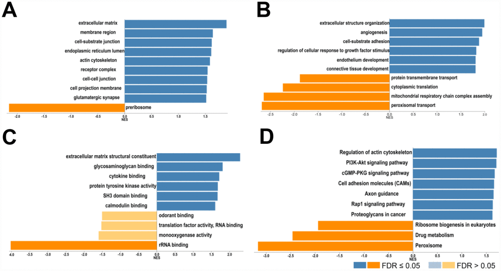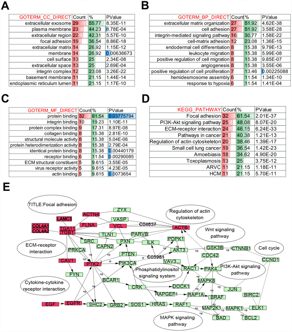 Next, the genes which correlated with COL4A1 and COL4A2 and differentially expressed in HCC were collected and analyzed by LinkedOmics to further examine the biological function of COL4A1 and COL4A2 in HCC. COL4A1 displayed a positive correlation with 7111 genes and negative with 3128 genes; whereas 6680 genes were positively correlated with COL4A2, whereas 2714 genes in the opposite (FDR < 0.01, Figure 6A and 6B). The top 20 most positively and negatively correlated genes for COL4A1 and COL4A2 were exhibited in the heatmap (Figure 6C–6F). This result implied a similar effect of COL4A1 and COL4A2 in the transcriptome. Specially, COL4A1/COL4A2 were highly correlated with PXDN (r = 0.8937 / 0.8904) and SPARC (r = 0.8882 / 0.9124), reflecting significant changes in the extracellular matrix of HCC (Figure 6D). Further, GO term analysis indicated that the COL4A1 and COL4A2 correlated genes were located prominently in the extracellular matrix, membrane region, and cell-substrate junction, where they served as structural constituents in the extracellular matrix. They also involved in extracellular structure organization, angiogenesis, and cell-substrate adhesion (Figure 7A–7C). Moreover, KEGG analysis result showed that these genes took part in activating actin cytoskeleton, PI3K-Akt, cGMP-PKG, and cell adhesion pathway (Figure 7D). Thus, these results further demonstrated that the biological interaction network of COL4A1 and COL4A2 is involved in ECM-receptor activated pathways.