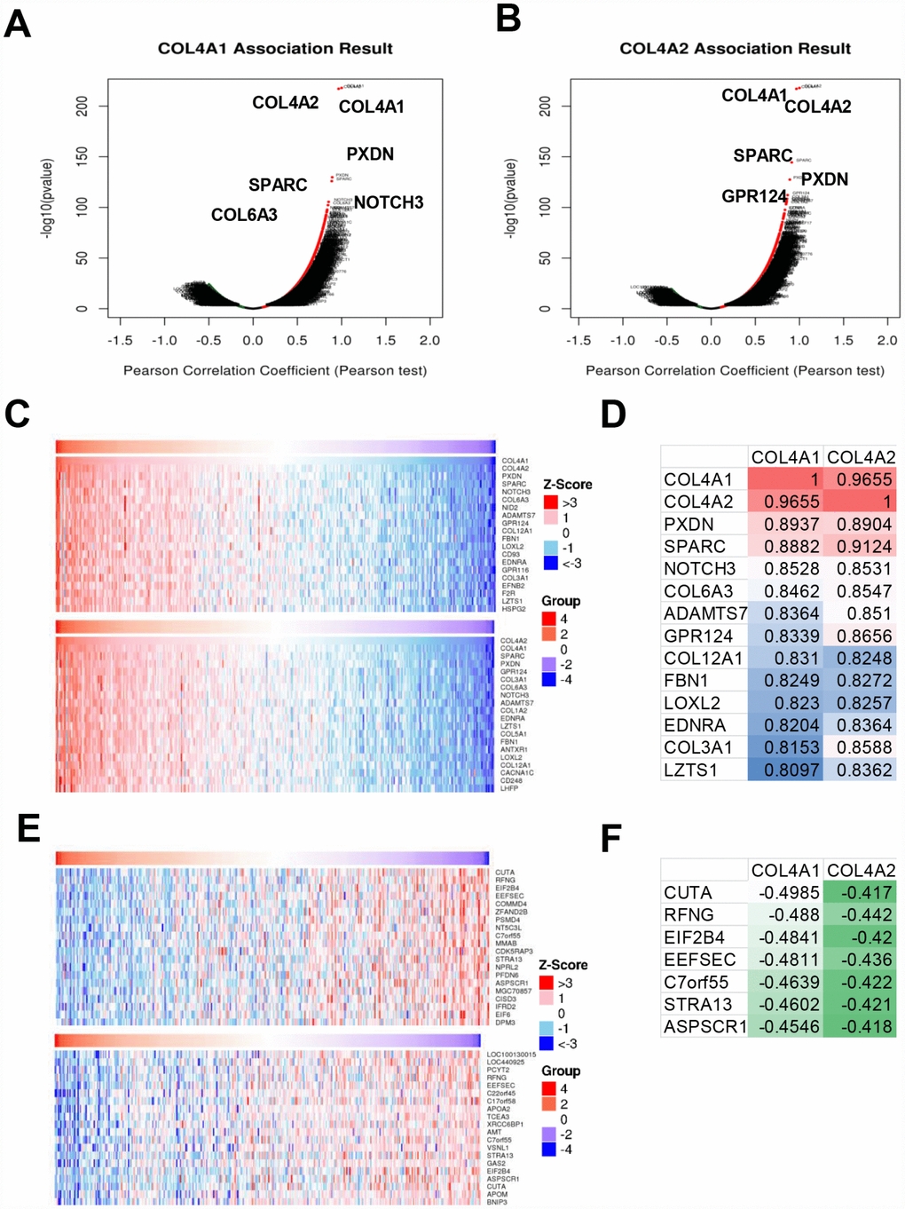 Moreover, the expression levels of COL4A1 and COL4A2 were highly correlated in 371 HCC patients (Figure 4A). Therefore, the correlation coefficient between COL4A1 and COL4A2 in HCC was calculated via cBioPortal. The results showed that COL4A1 was strongly correlated with COL4A2 (r = 0.96), possibly because they shared the same bidirectional promoter (Figure 4B, 4C).