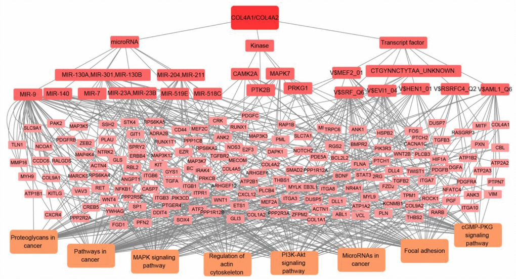 To discover the specific targets network of COL4A1 and COL4A2 in HCC, the most correlated kinases, miRNA, and transcription factors were collected and analyzed by GSEA. As summarized in Table 2, for COL4A1 and COL4A2 in HCC, the most correlated kinase-targets network were PRKG1, PTK2B, MAPK7, and CAMK2A; the most correlated microRNA-targets network were MIR-140, MIR-204/MIR-211, MIR-7, MIR-23A/MIR-23B, MIR-130A/MIR-301/MIR-130B, MIR-519E, MIR-518C, and MIR-9; the most correlated transcript factor-target networks were V$SRF_Q6, V$RSRFC4_Q2, CTGYNNCTYTAA_UNKNOWN, V$MEF2_01, V$AML1_Q6, V$HEN1_01 and V$EVI1_04 (v7.4 TRANSFAC). The target genes of these transcript factors, kinases, and microRNAs in HCC were listed in Supplementary Table 1. Furthermore, KEGG analysis showed that these genes involved in pathways in cancer, PI3K-Akt signaling pathway, focal adhesion, MAPK signaling pathway, regulation of actin cytoskeleton, microRNAs in cancer, proteoglycans in cancer, and cGMP-PKG signaling pathway (Figure 8). Thus, COL4A1 and COL4A2 may involve in hepatocarcinogenesis by activating the above-mentioned transcript factors-target networks, the kinase-target networks, and the microRNA-target networks.