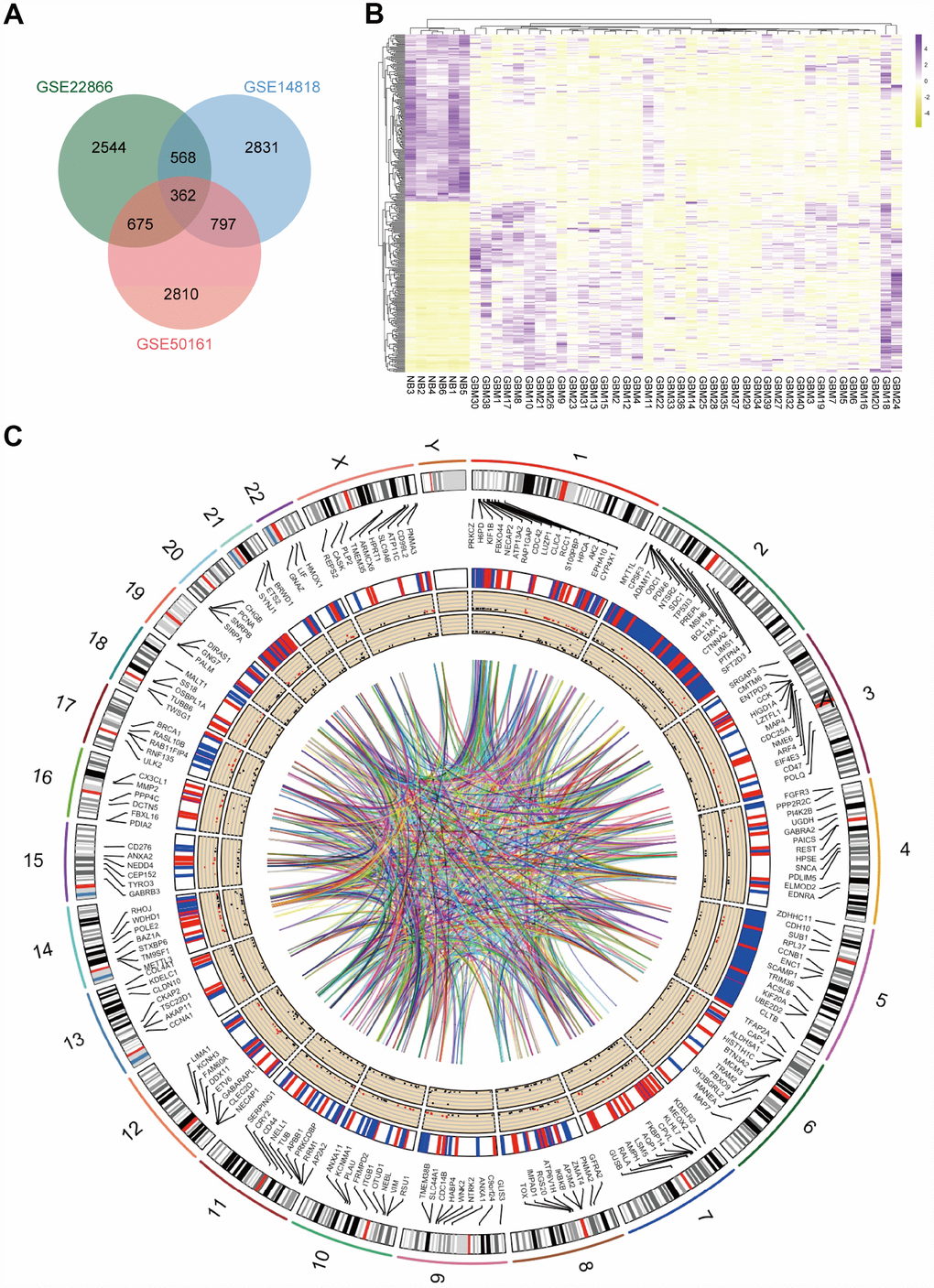 GBM and normal brain tissue gene expression profiles from GSE14818, GSE22866 and GSE50161 were obtained from NCBI-GEO. The GSE14818 microarray data had 10 GBM tissues and 2 normal brain tissues from Germany, and 5300 DEGs were obtained. Among them, 2006 downregulated genes and 3249 upregulated genes were identified. The GSE22866 dataset had 40 GBM tissues and 6 normal brain tissues from France, and overall, 7012 DEGs were screened from the dataset, including 5061 upregulated genes and 1951 downregulated genes. Additionally, 6627 DEGs, including 2849 upregulated genes and 3733 downregulated genes, were screened from the GSE50161 dataset, which had 34 GBM tissues and 8 normal brain tissues from America. A total of 362 consistently expressed genes were identified from the three datasets (Figure 1A) after integrated bioinformatical analysis, including 185 upregulated genes and 177 downregulated genes in the GBM tissues compared to normal brain tissues. To show the significant differential distribution of the 362 DEGs, a heat map of the up- and downregulated DEGs was drawn using the data profile from GSE22866 as a reference (Figure 1B). DEGs on human chromosomes are shown in the circos plot (Figure 1C).