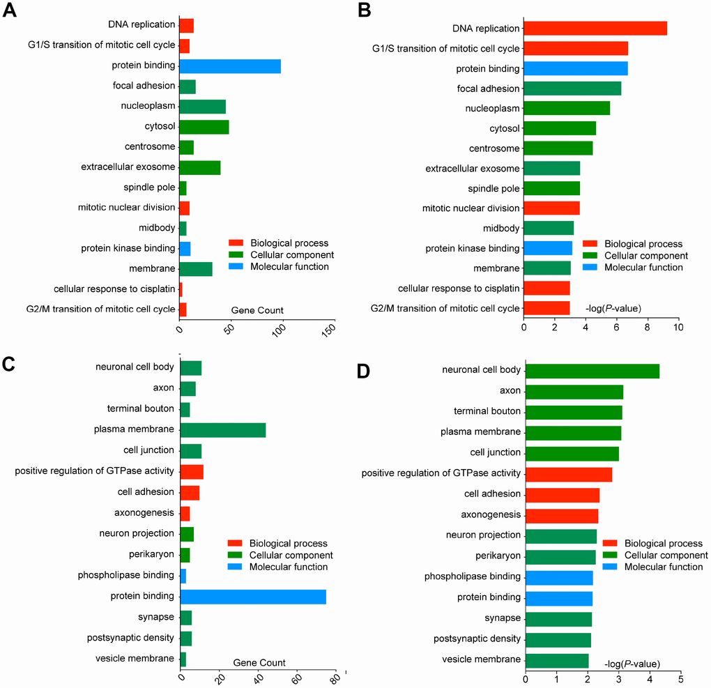 Functions and pathway enrichment of the candidate DEGs in GBM identified from an integrated analysis of microarray data were analysed using multiple online databases, including DAVID and KEGG PATHWAY. GO functional enrichments of up- and downregulated genes were performed with DAVID, and enriched GO terms with P-values < 0.05 were obtained. GO analysis of DEGs was divided into three functional groups, including biological processes (BP), cell composition (CC) and molecular function (MF). The enriched GO terms for the DEGs are presented in Figure 3. For the upregulated DEGs, the top 3 enriched GO terms for each group were DNA replication, G1/S transition of mitotic cell cycle and mitotic nuclear division in the BP category; focal adhesion, nucleoplasm and cytosol in the CC category; and protein binding, protein kinase binding and cysteine-type endopeptidase activity in the MF category (Figure 3A, 3B). Similarly, for the downregulated DEGs, the top 3 enriched GO terms for each group were positive regulation of GTPase activity, cell adhesion and axonogenesis in the BP category; neuronal cell body, axon and terminal bouton in the CC category; and phospholipase binding, protein binding and actin binding in the MF category (Figure 3C, 3D). These results showed that most of the DEGs were significantly enriched in transport, binding, cell parts and cell cycle.