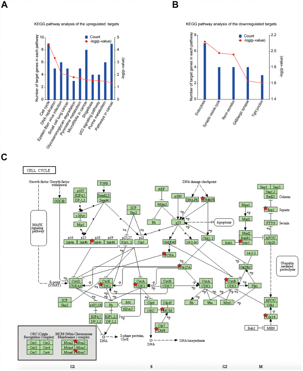 DEG functional and signalling pathway enrichment was performed using the DAVID and KEGG PATHWAY online websites. The enriched KEGG pathways for the upregulated DEGs include cell cycle, DNA replication, Epstein-Barr virus infection, small cell lung cancer, glycosaminoglycan degradation, pyrimidine metabolism, microRNAs in cancer, shigellosis, p53 signalling pathway, purine metabolism and pathways in cancer (Figure 4A). For the downregulated DEGs, the enriched KEGG pathways include endocytosis, synaptic vesicle cycle, renin secretion, GABAergic synapse and tight junction (Figure 4B). The cell cycle pathway was considered to be the most central functions because it shared the most connected genes and the lowest p value. Signalling pathway analysis showed that DEGs had the most common pathways in cell cycle (Figure 4C).