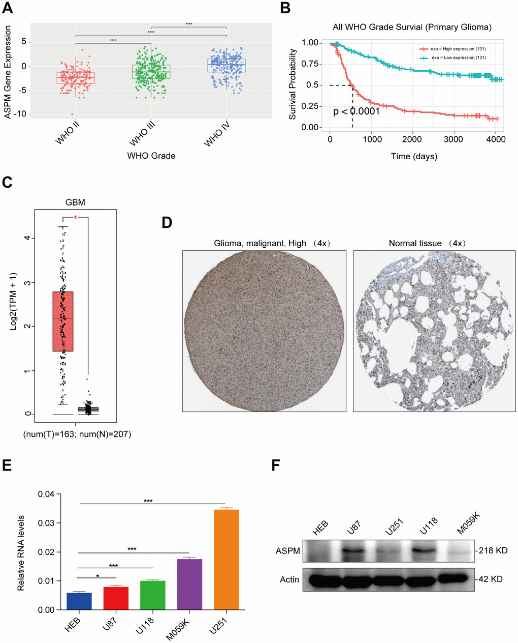 We then examined the expression of ASPM in glioma cell lines and discovered that the mRNA and protein expression levels of ASPM were similarly upregulated in 4 human glioma cell lines compared with the normal glial cell line (Figure 5E–5F). Taken together, these results collectively demonstrate that the upregulation of ASPM could serve as a new target for the investigation of potential GBM biomarkers.