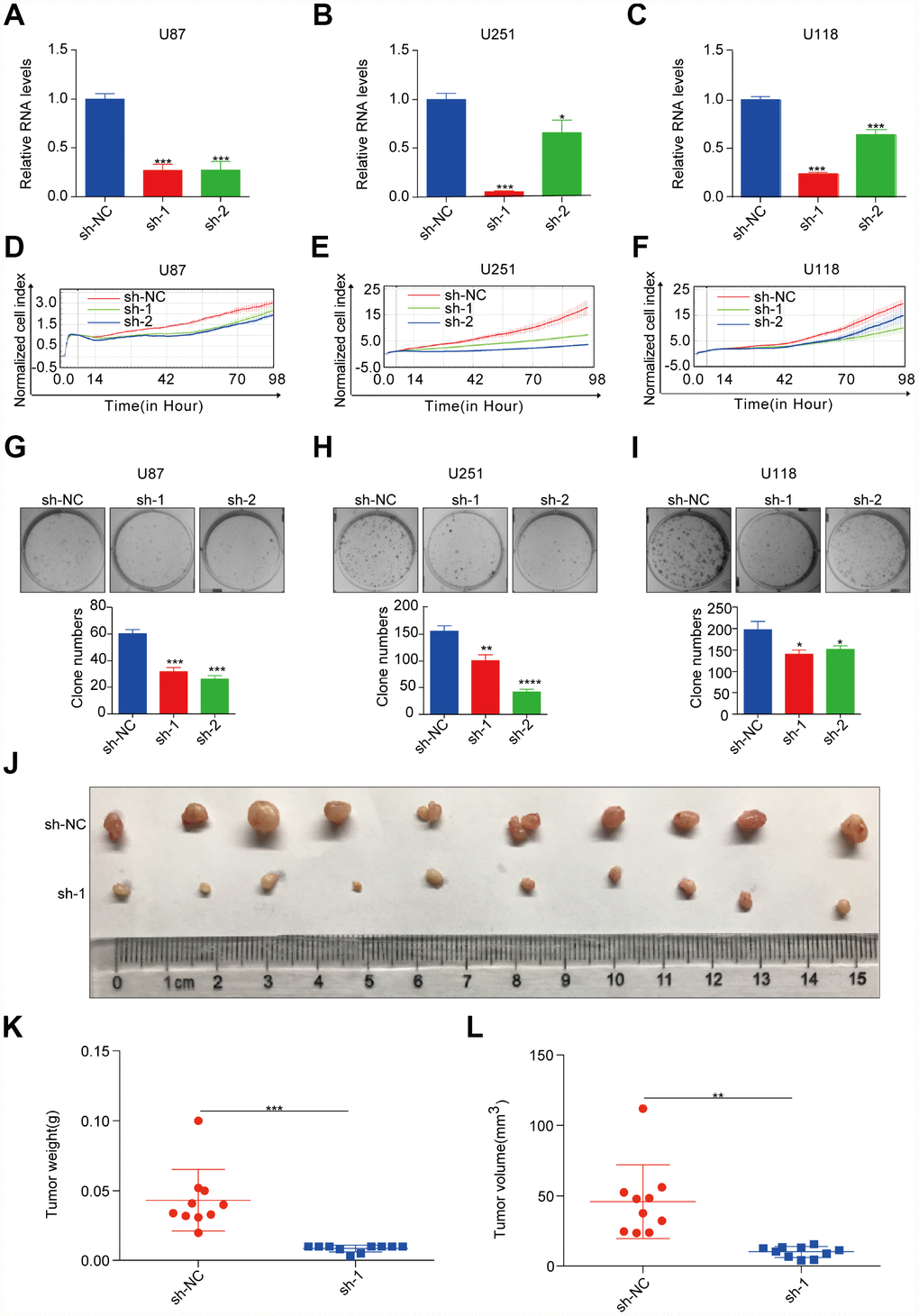 Briefly, 4-week-old male athymic nude mice were used for the xenograft model. U251 cells stably expressing sh-NC and sh-1 were trypsinized and washed twice with sterilized PBS, and then 0.2 ml of PBS containing 5 x 106 cells was subcutaneously inoculated into the inguinal area of the mice. Tumour volume was calculated using the formula: tumour volume = 0.5 × (width)2 × length. All animal experiments were undertaken in accordance with the NIH Guide for the Care and Use of Laboratory Animals, with the approval of the Institutional Animal Care and Use Committee of the Cancer Hospital Chinese Academy of Medical Sciences.