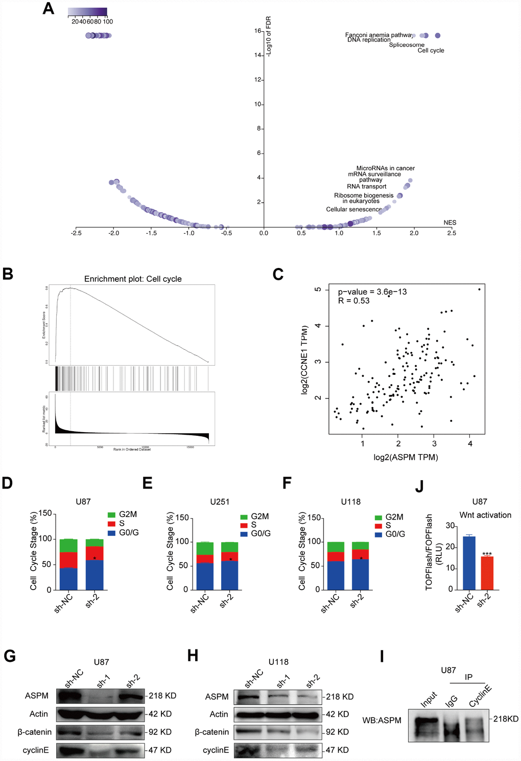 To further explore the underlying mechanism by which ASPM promotes the cell growth of GBM, we analysed the enriched signalling pathways involved in ASPM-related genes by searching the LinkedOmics (http://www.linkedomics.org/login.php) database and found that cell cycle is the most enriched pathway (Figure 7A). This is also supported by GSEA analysis (Figure 7B). It is known that ASPM could stabilize cyclin E abundance and passage through the G1 restriction point during NPC division [12], We observed that the expression of cyclin E is strongly correlated with ASPM in TCGA GBM by Spearman’s rank correlation (Figure 7C). Moreover, cell-cycle analysis revealed that stable knockdown of ASPM resulted in arrest at the G0/G1 phase in U87, U251 and U118 cells (Figure 7D–7F). As expected, knockdown of ASPM reduced the expression of cyclin E in U87 and U118 cells (Figure 7G, 7H). In addition, cyclin E was capable of co-immunoprecipitating ASPM (Figure 7I). These data indicate that ASPM interacts with cyclin E and is likely to control cell cycle via cyclin E.