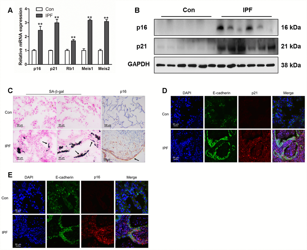 As IPF is a senescence-associated disease, the mRNA levels of p16, p21, Rb1, Meis1 and Meis2, typical markers of senescence, were measured by Q-PCR (Figure 1A). The protein levels of p16 and p21 were further determined by Western blot (Figure 1B). The results showed an increased expression of established senescence markers in the lung tissues derived from IPF (Figure 1A and 1B). In addition, we found that increased positive staining of SA-β-gal and p16 were located in the epithelial area (Figure 1C, black arrow), which was hardly seen in normal lung tissues. In order to confirm whether epithelial cells were senescent in the progression of IPF, we performed co-staining on the lung sections of donors and IPF patients. We found that p16 and p21 were elevated in epithelial cells as demonstrated by co-localization with E-cadherin, a marker of epithelial cells (Figure 1D and 1E). These results demonstrated epithelial senescence may be tightly correlated with the development of IPF.