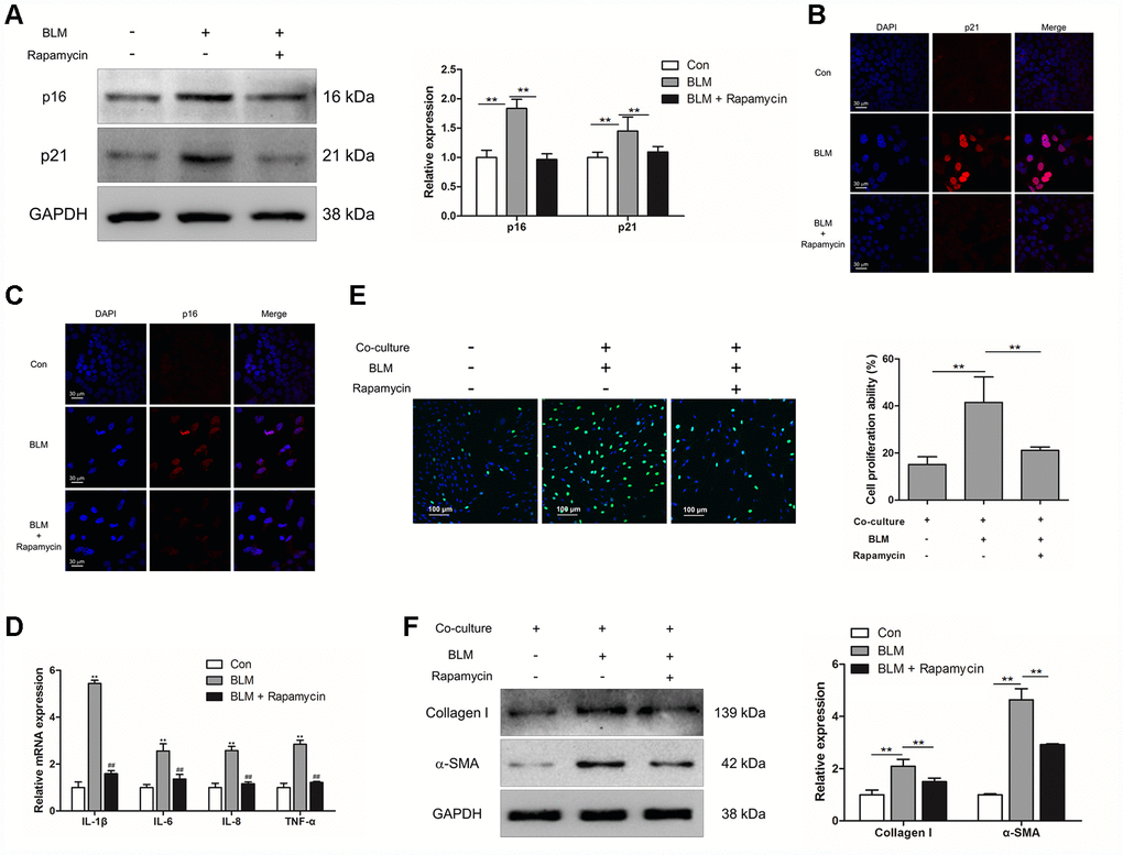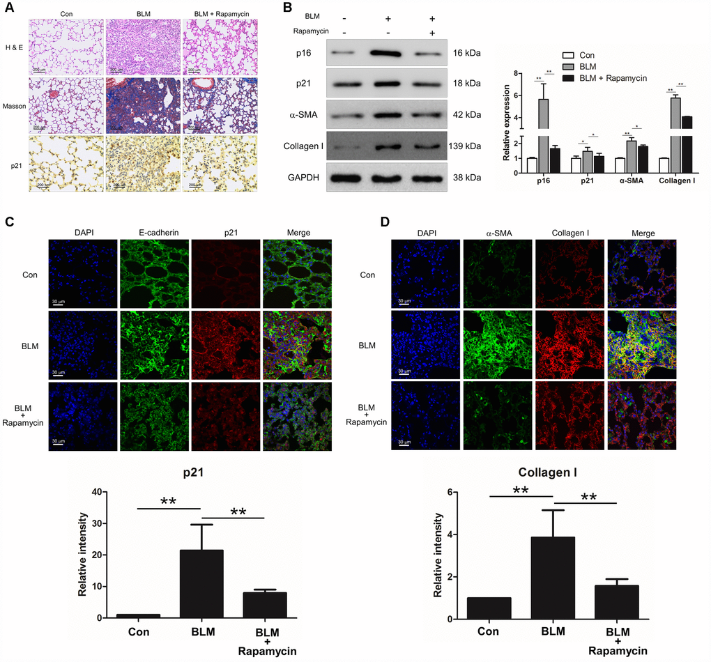 We next investigated whether suppression of cell senescence could block the development of pulmonary fibrosis. Experimental animal models were intraperitoneally injected with rapamycin, which is reported as an inhibitor of senescence. Compared with BLM-treated mice, rapamycin evidently decreased the extent of lung lesions and attenuated collagen deposition (Figure 2A) via impairing the expression of senescence markers p16 and p21 (Figure 2B). In addition, the immunofluorescence results also showed that rapamycin profoundly attenuated epithelial cell senescence (Figure 2C) and decreased the levels of fibrotic markers α-SMA and collagen I in vivo (Figure 2B and 2D), suggesting that rapamycin could ameliorate BLM-induced pulmonary fibrosis through impairing epithelial cell senescence.
