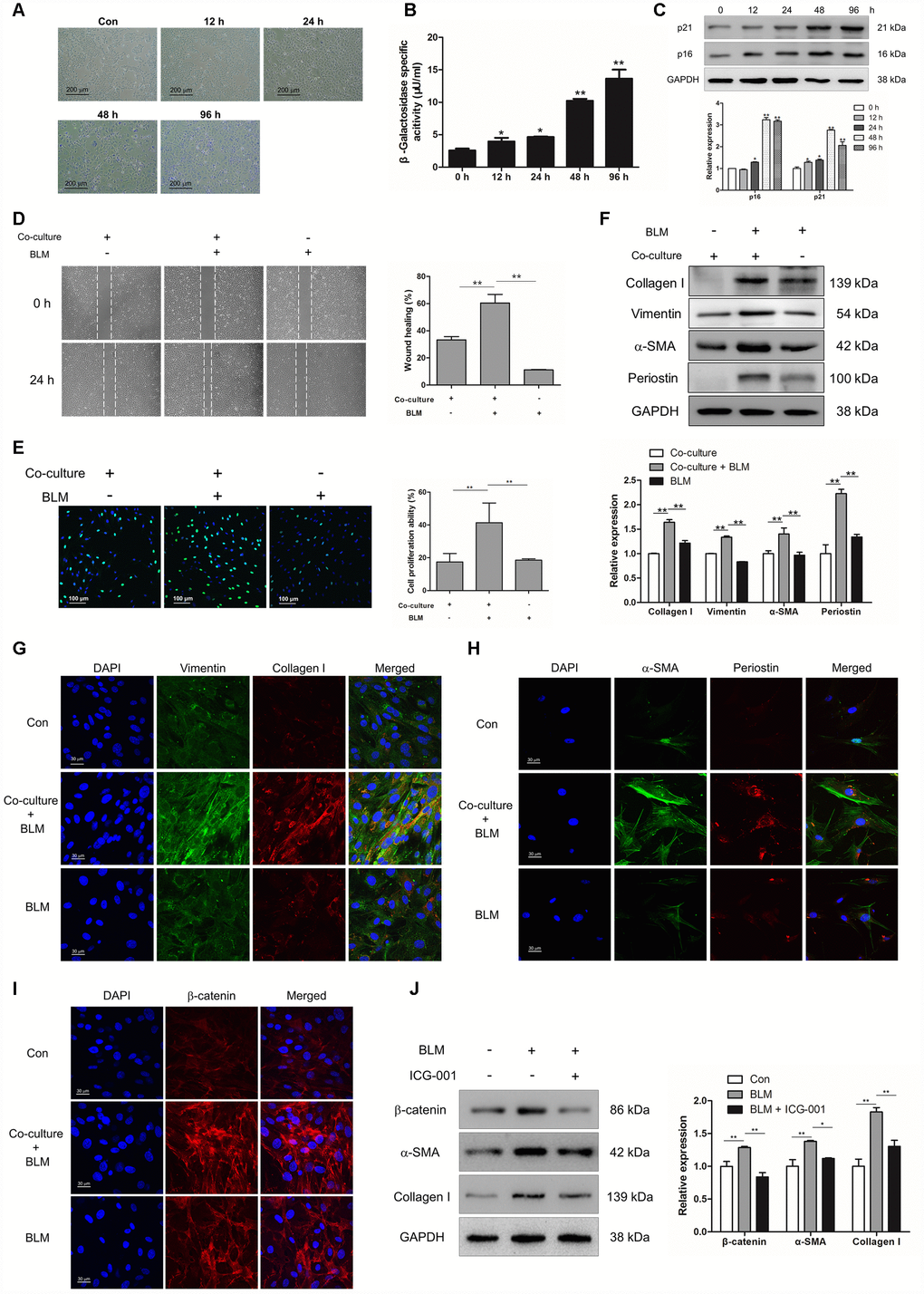 In order to uncover the role of epithelial cell senescence in the progression of IPF, we established a BLM- induced epithelial cell senescence model in vitro. MLE-12 cells were treated with BLM for 12, 24, 48 and 96 h. BLM could increase the number of senescent cells and enhance the activity of β-galactosidase in a time-dependent manner (Figure 3A and 3B). In addition, the increased expression of p16 and p21 were both increased in a time-dependent manner in BLM-stimulated MLE-12 cells (Figure 3C). To further confirm whether the profibrotic role of senescent epithelial cells in IPF was mediated through inducing the activation of pulmonary fibroblasts, mouse pulmonary fibroblasts were co-cultured with MLE-12 cells that were pre-treated with BLM for 3 days. Interestingly, we found that senescent MLE-12 cells could increase the migration and proliferation of pulmonary fibroblasts (Figure 3D and 3E). In the co-culture system, senescent MLE-12 cells could profoundly induce the expression of α-SMA, vimentin, collagen I and periostin (Figure 3F and 3G). However, the enhanced migration and proliferation of pulmonary fibroblasts did not occur in BLM-treated pulmonary fibroblasts, and BLM treatment could not significantly induce the expression of α-SMA, vimentin, collagen I and periostin (Figure 3D–3H), indicating that BLM could not directly induce the activation of pulmonary fibroblasts, but through inducing the senescence of epithelial cells. In addition, Wnt signalling was activated in the co-culture system, as determined by increased expression of β-catenin in pulmonary fibroblasts (Figure 3I). Inhibition of Wnt signalling via ICG-001 could effectively suppress the expression of α-SMA and collagen I (Figure 3J). These results suggested that senescent epithelial cells could promote the activation of pulmonary fibroblasts via activation of Wnt signalling.