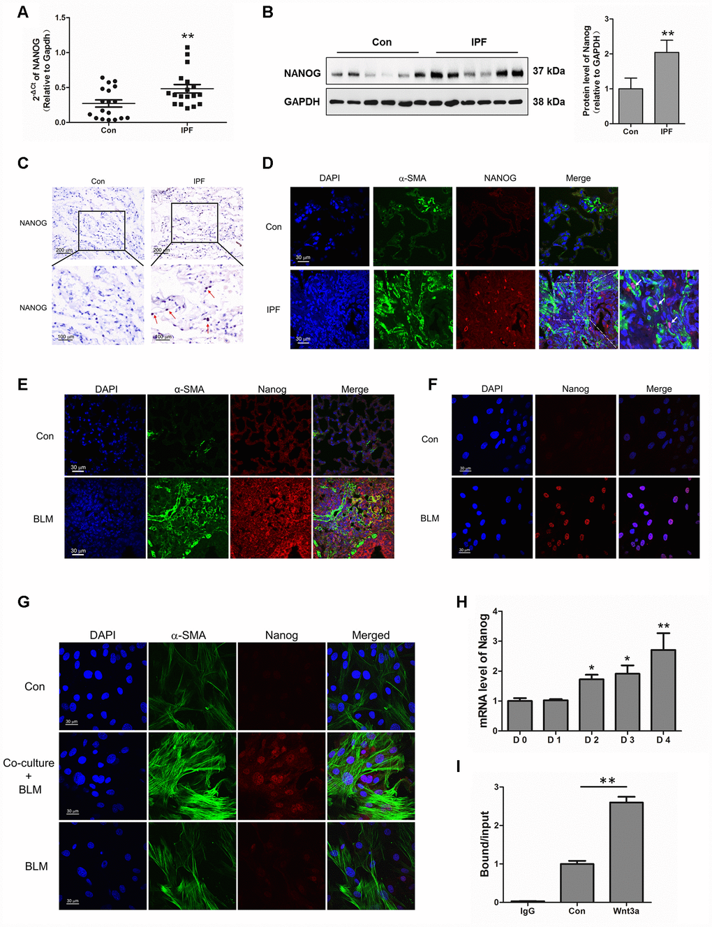 Interestingly, we found that Nanog, a marker of stem cells, was highly elevated in IPF lung tissues (Figure 5A–5C). The co-localization of Nanog and α-SMA also demonstrated that Nanog was overexpressed in the fibroblasts of IPF (Figure 5D), suggesting that the acquired phenotype of Nanog may play an essential role in the activation of pulmonary fibroblasts. In experimental pulmonary fibrosis models, we also found that Nanog staining was increased in fibroblasts as demonstrated by co-localization with α-SMA (Figure 5E). In vitro, we further confirmed this finding in pulmonary fibroblasts isolated from mouse fibrotic lung tissues (Figure 5F). In addition, the expression of Nanog was highly elevated in pulmonary fibroblasts co-cultured with senescent epithelial cells (Figure 5G). It has been demonstrated that Wnt signalling plays a critical role in the activation of fibroblasts [24]. In order to further uncover the underlying mechanism between Wnt signalling and Nanog, pulmonary fibroblasts were treated with Wnt3a for various durations. Wnt3a could induce the mRNA expression of Nanog in a time-dependent manner (Figure 5H). In addition, the chromatin immunoprecipitation (ChIP) assay results demonstrated that Wnt3a could enhance the recruitment of β-catenin to the promoter of Nanog, which leads to the aberrant expression of Nanog in pulmonary fibroblasts (Figure 5I). These results indicated that the activation of Wnt/β-catenin signalling is responsible for the acquired phenotype of Nanog in activated pulmonary fibroblasts.