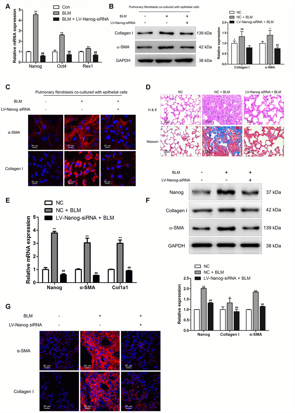 Suppression of Nanog could effectively attenuate the mRNA and protein levels of collagen I and α-SMA (Figure 6E and 6F). Immunofluorescence staining also revealed that LV-Nanog-siRNA could retard pulmonary fibroblast activation in BLM-induced pulmonary fibrosis, as confirmed by decreased expression of α-SMA and collagen I (Figure 6G). These results demonstrated that inhibition of Nanog could suppress the development of pulmonary fibrosis via impairing the activation of pulmonary fibroblasts.