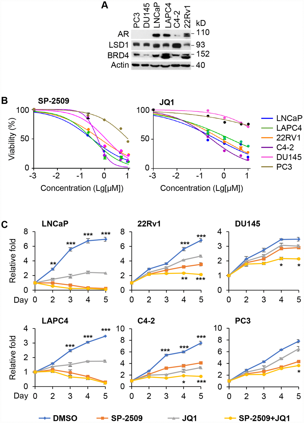 The human PCa cell lines, LNCaP, LAPC4, 22Rv1, C4-2, PC3 and DU145 were purchased from the American Type Culture Collection (Manassas, VA) and grown in RPMI medium plus 10% fetal bovine serum. All cell lines are tested for mycoplasma contamination regularly. As indicated, cells were treated with drugs or DMSO-containing vehicle that was equal volume to 1 μM SP-2509 or 1 μM JQ1 alone, or in combination for different time intervals, or for 3 days at different concentrations.