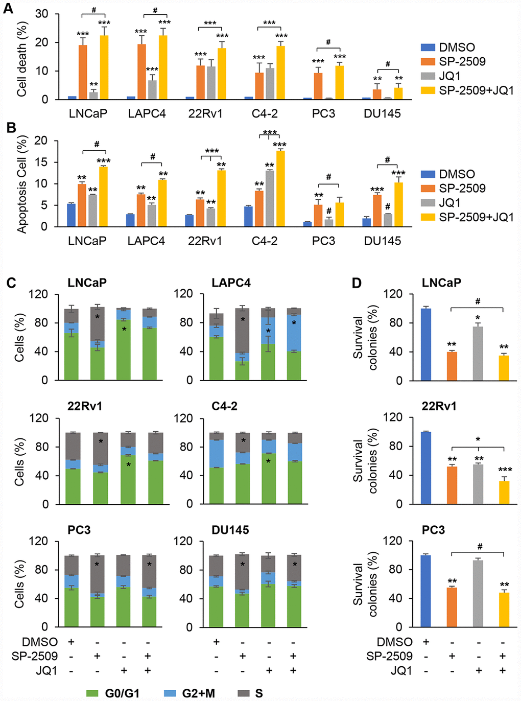 To explore the growth inhibition induced by JQ1 and SP-2509, we evaluated apoptosis using two different techniques, and cell cycle intervals after treatment in these three different PCa cell types. Consistent with results obtained with cell proliferation, treatment of LNCaP and LAPC4 cells with SP-2509 resulted in a marked increase in apoptosis compared with vehicle treatment (Figure 2A and Supplementary Figure 1A), but the effect of JQ1 treatment on apoptosis was much less dramatic. No additional increase in apoptosis was observed in LNCaP and LAPC4 cells when JQ1 was added to SP-2509. Consistent with our previous results, both SP-2509 and JQ1 resulted in a marked increase in apoptosis and had an additive effect in the castration-resistant cells, 22Rv1 and C4-2. In agreement with the cell proliferation finding for PC3 and DU145 cells, SP-2509 but not JQ1 induced cell death, and co-treatment with JQ1 and SP-2509 provided no additional cell death over that observed with SP-2509 alone (Figure 2A and Supplementary Figure 1A). To confirm these cell death findings, we performed the apoptosis assay with Annexin V-FITC/PI flow cytometry. Again, SP-2509 significantly induced apoptotic cell death in all these three PCa cells types while JQ1 induced apoptotic cell death only in AR positive cells but not in AR-negative cells (Figure 2B and Supplementary Figure 1B). Notably, combined treatment with SP-2509 and JQ1 had an additive effect in castration resistant prostate cells (22Rv1 and C4-2) but not in other two type of PCa cells. We also found that SP-2509 treatment led to a significant number of cells at the S phase in all the PCa cell types while the JQ1 treatment led to an accumulation in the G0/G1 phase in LNCaP, 22Rv1 and C4-2 cells (Figure 2C). We did not detect any significant change in cell cycle pattern for DU145 and PC3 cells treated with JQ1 alone, but noted an accumulation of cells in S phase with co-treatment as well as with SP-2509 alone (Figure 2C). We also assessed colony formation to investigate a long-term effect of JQ1 and SP-2509 on proliferation. As shown in Figure 2D, the colony formation for all cell lines was reduced after exposure to SP-2509. Furthermore, the reduction was more apparent when SP-2509 was combined with JQ1 in the castration-resistant cells. However, JQ1 significantly inhibited colony formation only in the AR-positive cells and had no significant effect on AR-negative cells. These results indicate that the SP-2509 and JQ1 have different effects in AR-positive and AR-negative PCa cells.