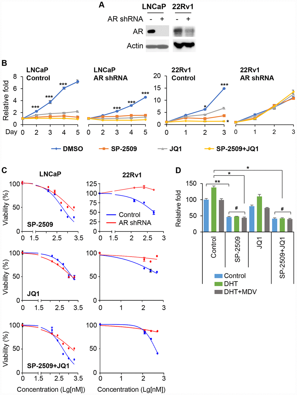 Because both BRD4 and LSD1 interact with the AR and are recruited to AR target genes, and because JQ1 and SP-2509 treatments lead to different effects in AR-positive and AR-negative cells, we next sought to investigate whether the drug-induced growth inhibitions were associated with disturbance in AR expression. To test this concept, we first infected LNCaP (AR+ and responsive) and 22Rv1 cells (AR+ and non-responsive) with validated AR shRNA lentivirus, and achieved almost complete depletion of AR expression (Figure 3A). We observed that depletion of AR significantly reduced the sensitivity of LNCaP cells to SP-2509 but not JQ1 (Figure 3B). Surprisingly, AR knockdown completely abolished the inhibition produced by SP-2509 or/and JQ1 in 22Rv1 cells. To confirm these observations, we treated the cells with different concentrations of JQ1 or SP-2509 for 48 h. We found that SP-2509 had a less pronounced effect on proliferation in AR-knockdown cells compared to the control in LNCaP cells (Figure 3C). However, there was no difference in growth inhibition between control and AR-knockdown cells with JQ1 treatment. And again, AR depletion resulted in a refractory response to SP-2509 or/and JQ1 treatment in 22Rv1 cells. We also evaluated the effect of these two inhibitors in LNCaP cells treated with dihydrotestosterone (DHT), the active androgen metabolite, for 48 h. Corroborating other reports, we found that DHT-treatment significantly increased LNCaP cell proliferation (Figure 3D); however, SP-2509 abolished the proliferation induced by DHT. In addition, we treated the LNCaP cells with SP-2509 in combination with DHT-enzalutamide (MDV), a next-generation AR antagonist. Treatment with SP-2509 was more effective compared with treatment with DHT-enzalutamide in inhibiting cell proliferation. However, combinational treatment with SP-2509 and DHT-enzalutamide had no additional effect compared to SP-2509 treatment alone. JQ1 had only a modest effect on cell proliferation under these conditions.