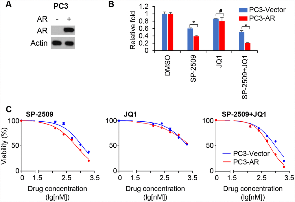 To corroborate the role of AR expression in the action of two inhibitors, we ectopically expressed AR in PC3 cells (Figure 4A). Proliferation analysis demonstrated that AR-overexpressing PC3 cells were more sensitive to SP-2509 compared with control cells (Figure 4B). However, AR expression produced no inhibition in cell proliferation by JQ1. Treatment with different concentrations of JQ1 or SP-2509 confirmed that AR overexpression sensitized SP-2509-induced growth inhibition but not JQ1-induced growth inhibition in PC3 cells (Figure 4C). Again, treatment with SP-2509 and JQ1 had no additive effect on decreasing cell viability compared to SP-2509 treatment alone in AR-overexpressing PC3 cells. Together, these results suggested that AR expression is critical for mediating control of cell proliferation in AR-positive/androgen-sensitive PCa cell lines; inhibition of LSD1 function by SP-2509 decreased proliferation in these cells while inhibition of BRD4 had little effect. However, AR expression is crucial for both of these inhibitors in AR-positive but castration-resistant PCa cells.