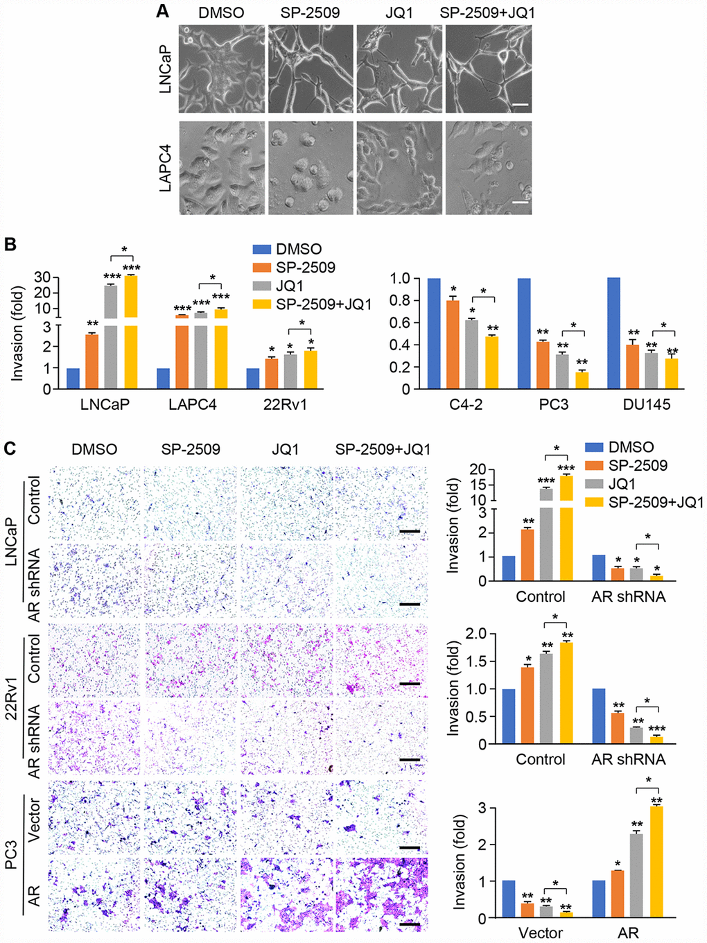 To investigate the role of these two inhibitors on metastatic capability, we treated LNCaP and LAPC4 cells with SP-2509 and JQ1 alone or combination for 24 h; we noticed that the cells acquired a spindle-shaped morphology (Figure 5A). To assess whether these morphologic changes were associated with invasive capability, we evaluated the effects of JQ1 and SP-2509 on tumor invasiveness for AR-positive and AR-negative cell types. Cells were pre-treated with JQ1 and SP-2509 alone or in combination for 24 h and then examined for invasive activity through a Matrigel-coated membrane. As shown in Figure 5B and Supplementary Figure 2, JQ1 treatment dramatically increased cell invasion in LNCaP and LAPC4 cells, with only a slight increase in invasive capacity after SP-2509 treatment. In addition, the combined treatment of JQ1 and SP-2509 increased invasion compared to either treatment alone (Figure 5B). Strikingly, we found that JQ1 and SP-2509 appear to have different effects in castration-resistant cells. Both SP-2509 and JQ1 increased invasion in 22Rv1 cells but inhibited invasion in the C4-2 cells. In contrast, both of SP-2509 and JQ1 significantly inhibited tumor cell invasion in PC3 and DU145 cells; co-treatment with JQ1 and SP-2509 synergistically reduced cell invasion in PC3 and DU145 cells. To further explore the effect of AR expression on cell invasion, we treated the LNCaP AR-knockdown cells, 22Rv1 AR-knockdown cells or PC3 AR-expressing cells with SP-2509 and JQ1 alone or in combination for 24 h. Strikingly, depletion or expression of AR completely reversed the effect of SP-2509 and JQ1 on these cells (Figure 5C). Both JQ1 and SP-2509 suppressed invasion in the modified LNCaP and 22Rv1 AR-knockdown cells, while these inhibitors promoted invasion in AR-expressing PC3 cells. These results suggest that JQ promotes a robust increase in tumor invasive capacity in high AR-expressing PCa cells but decreases invasive capacity in low/negative AR-expressing PCa cells and that the two compounds act in a synergic manner. Most importantly, AR expression plays a key role in the inhibition of invasion with JQ1 and SP-2509.