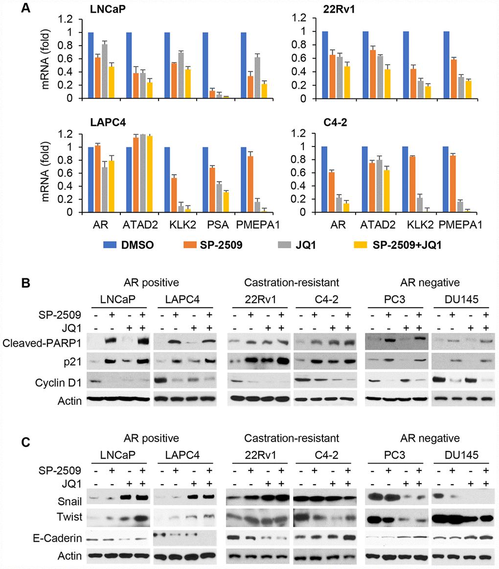 Our results suggested that the AR was important for both LSD1 and BRD4 inhibition. To further examine these relationship, we first knocked down LSD1 or BRD4 and assessed AR expression in LNCaP and 22Rv1 cells. Silencing LSD1 or BRD4 not only reduced AR full length expression in LNCaP and 22Rv1 cells but also AR-V7 in 22Rv1 cells (Supplementary Figure 3A). Consistent with this, treatment with SP-2509 or JQ1 recapitulated the results (Supplementary Figure 3B). Combined treatment with SP-2509 and JQ1 further reduced the AR expression. We then evaluated mRNA expression levels of AR-target genes using real-time qPCR. We found that treatment with the two inhibitors decreased AR expression and classical AR-target genes (ATATD2, KLK2, PSA and PMEPA1) in all AR-positive prostate cell lines (Figure 6A). In support of our data on cytotoxic effects, treatment with SP-2509 was associated with a remarkable increase in cleaved PARP in all three type PCa cells while treatment with JQ1 slightly increased expression of cleaved PARP (Figure 6B) in AR-positive but not AR-negative PCa cells. Importantly, both SP-2509 and JQ1 increased cleaved PARP expression in castration-resistant PCa cells. Previous findings demonstrated that LSD1 inhibition blocks neuroblastoma cell proliferation and regulates pivotal genes controlling the cell cycle such as CDKN1A/p21 [33]. Therefore, we examined the expression of genes controlling cell cycles. Treatment with SP-2509 in AR-positive (LNCaP, LAPC4, 22Rv1 and C4-2) prostate cells significantly increased expression of p21 but decreased expression of Cyclin D1 (Figure 6B). Consistent with apoptotic results, JQ1 only slightly increased expression of p21 and down-regulated expression of Cyclin D1 in LNCaP and LAPC4 cells but significantly regulated these two genes in 22Rv1 and C4-2 cells. In DU145 and PC3 cells, the expression levels of these genes were unaffected by JQ1 treatment but SP-2509 treatment result in a slight increase in p21 and decrease in Cyclin D1. These results are agreement with our previous findings that SP-2509 inhibited cell growth and induced cell apoptosis in all these cells, and that JQ1 induced cell apoptosis only in AR-positive cells but not in AR-negative cells.