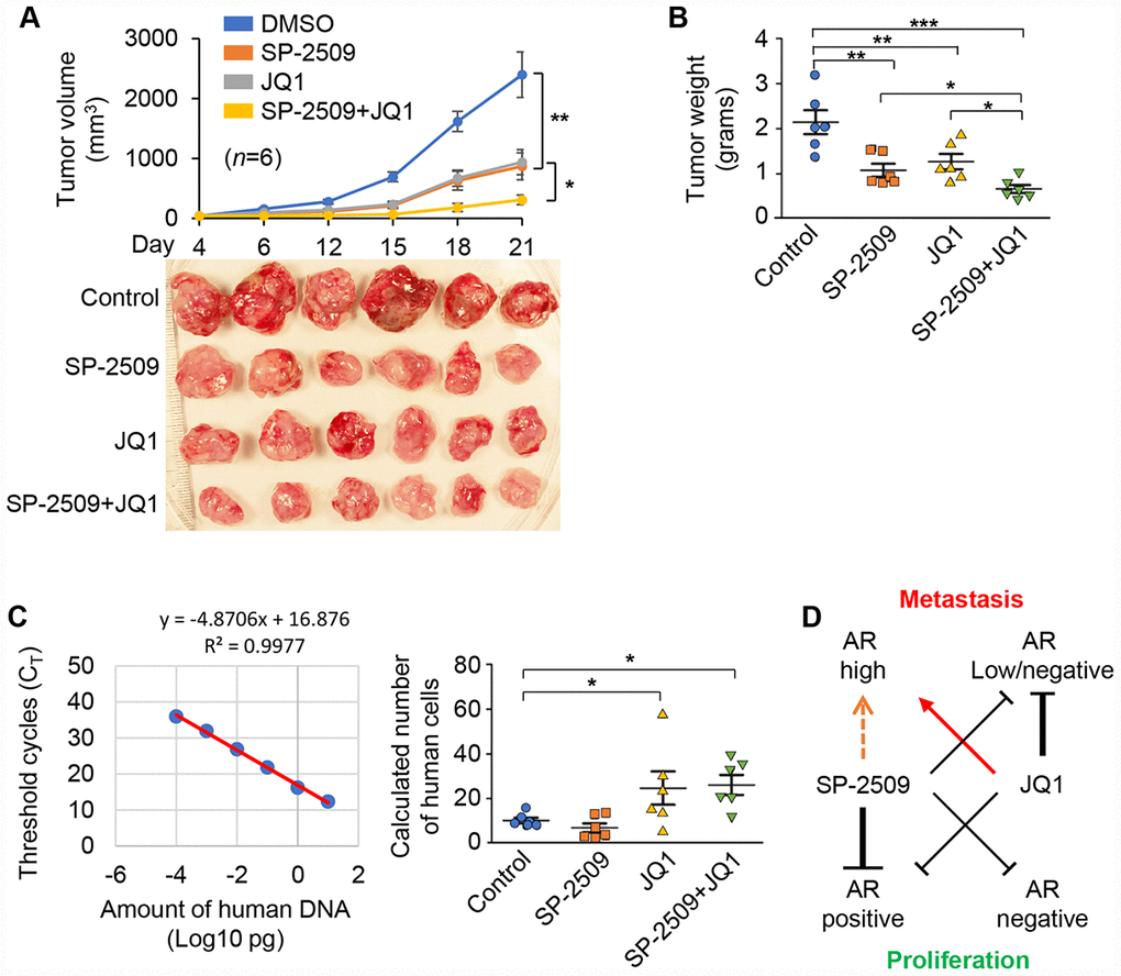 To assess the effects of these two inhibitors in vivo, we implanted the 22Rv1 cells into nude mice treated with SP-2509 and JQ1 alone or together. As shown in Figure 7A, monotherapies with SP-2509 or JQ1 significantly inhibited the tumor growth compare with untreated control group. Importantly, the combination of SP-2509 and JQ1 led to a significantly greater inhibition in tumor growth than did either SP-2509 or JQ1 alone. In addition, the tumor weights were also significantly reduced after drug treatment (Figure 7B). To investigate whether SP-2509 and JQ1 treatment alter spontaneous metastasis in our 22Rv1 xenograft model, we isolated femur and liver from drug-treated mice and found evidence of disseminated cells in the femur but not in the liver after JQ1 treatment (Figure 7C and data not shown). However, SP-2509-treated mice showed no evidence of metastasis. In summary, these studies support the notion that JQ1 inhibits tumor growth but induces metastasis in high AR-expressing PCa cells. These results are also consistent with our observation in the cell-based study, providing additional evidence of inhibition by SP-2509 and JQ1 in PCa proliferation and metastasis in vitro and in vivo.