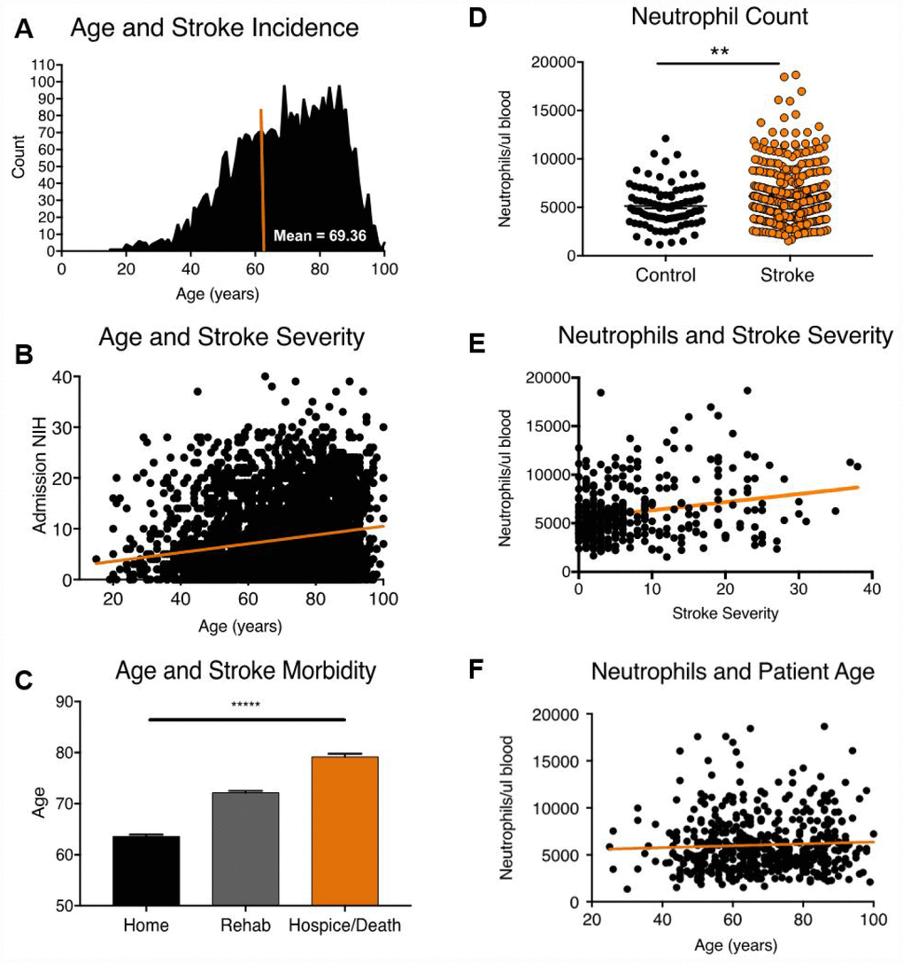 Linear regression analysis was used to examine the association between patient age and NIHSS admission severity (as a continuous variable). The secondary functional outcome was designated as discharge disposition, as a method of determining mortality (death or discharge to hospice) and morbidity (significant disability requiring significant rehabilitation or long-term care). Discharge disposition was categorized into three groups: Home with or without services (low morbidity), discharge to sub-acute or acute rehab (high morbidity), or death/hospice discharge (death). The relationship between discharge disposition and age was examined via Kruskal-Wallis testing. Human neutrophil counts: Differential neutrophil counts were analyzed by two-tailed Mann-Whitney test. The associations of neutrophil counts with age and stroke severity were analyzed by linear regression, followed by multivariate multiple regression to control for potential confounding variables. Human cytokine levels: Differences in two selected serum cytokines (IL-6 and IL-8) between stroke and control patients were analyzed by Mann-Whitney test. Linear regression was then used to examine the univariate relationship between stroke patient age and serum levels of IL-6 and IL-8 at 24 hours. Finally, multivariate multiple regression analysis to assess the independent relationship between stroke patient age and serum IL-6 and IL-8 after adjustment for stroke severity and patient gender as potential confounding variables. Animal study statistics were analyzed by two-tailed T-test, ANOVA or Kruskal-Walls testing, where appropriate (GraphPad, Prism).