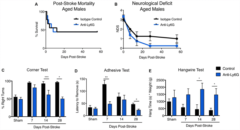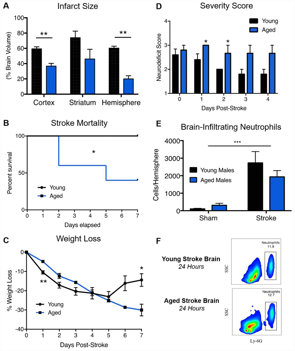 Previous work from our lab found that the aged immune system contributes to poorer stroke outcomes, and that brain-infiltrating neutrophils in aged animals produce higher levels of reactive species than those in young animals [17]. In the present study, we sought to determine how age changes the neutrophil response to ischemic stroke, and whether age influences the direct contribution of neutrophils to stroke pathophysiology.