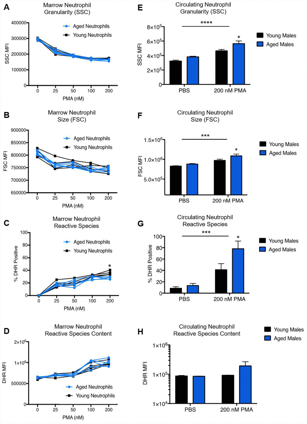 As we observed no significant age differences in reactive species generation in bone marrow neutrophils, it is possible that age differences in neutrophil function may result from environmental factors rather than cell-intrinsic processes. Aging has been suggested to result in an increase in circulating pro-inflammatory cytokines, a process known as “inflammaging”. To this end, we hypothesized that neutrophils from the bone marrow might begin to exhibit enhanced oxidative functions after exposure to enhanced pro-inflammatory signals in the aged circulation. Circulating murine neutrophils from naïve mice were exposed to 200 nM PMA or PBS control (Figure 3). Stimulation with 200nM PMA resulted in a significant increase in neutrophil side scatter (SSC), a marker of enhanced granularity/activation, in both groups. Interestingly, aged neutrophils were found to have significantly higher SSC than young neutrophils across groups (two-way ANOVA, interaction p=0.3758, stim p=<0.0001, age p=0.0078), which remained significant in the stimulated group after multiple comparisons analysis (p=0.02). A similar pattern was seen in neutrophil forward scatter (FSC) by two-way ANOVA (Figure 3F, interaction p=0.3202, stim p=0.0004, age p=0.0229), with significantly higher FSC in stimulated aged neutrophils compared to young neutrophils after stimulation by multiple comparisons (p=0.05). Measurement of intracellular reactive species production showed that a significantly higher percentage of aged neutrophils were positive for intracellular reactive species after PMA stimulation (Figure 3G, two-way ANOVA with multiple comparisons, p=0.0382), with a trend towards increased reactive species content (Figure 3H, two-way ANOVA with multiple comparisons, p=0.1782) compared to young.