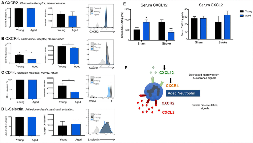 We next measured circulating levels of CXCL12 (a bone marrow homing chemokine recognized by CXCR4) and CXCL2, the bone marrow release cytokine recognized by CXCR2 (Figure 4E). A significant interaction effect of age and stroke was seen in CXCL12 levels (Two-way ANOVA, p<0.0001), with aged animals showing higher levels of CXCL12 (p=0.05) under sham conditions, but significantly lower levels of CXCL12 (p=0.006) than young animals after ischemic stroke. No significant effects of age or stroke were seen on levels of CXCL2. A schematic figure illustrating the pattern of CXCL2 and CXCL12, and their cognate receptors CXCR2 and CXCR4, in aged mice is shown (Figure 4F).