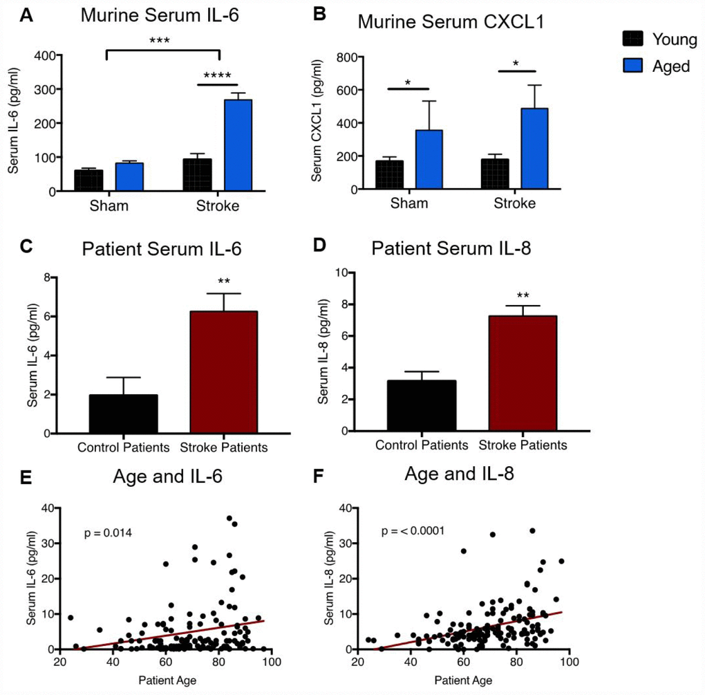 Given the age-related increases in neutrophil-activating cytokines in mice after stroke, we next examined serum levels of IL-6 and IL-8 (the human homolog of murine CXCL1) in ischemic stroke patients and controls at 24 hours (Supplementary Table 5, Figure 5). Stroke patients were found to have significantly higher levels of serum IL-6 (stroke: 6.26 ± 9.23 pg/ml, control: 1.96 ± 3.77 pg/ml, p=0.0014, Figure 5C) and IL-8 (stroke: 7.27 ± 36.53 pg/ml, control: 3.15 ± 2.47 pg/ml, p=0.0017, Figure 5D) compared to controls (Figure 5C). Within the stroke patient population, we found that increased age was significantly positively associated with higher levels of IL-6 (p=0.015, Figure 5E) and IL-8 (p<0.0001, Figure 5F) in serum 24 hours after stroke. To assess the effects of age independently from other confounding variables (initial stroke severity and patient sex), we performed multivariate multiple regression analysis (Supplementary Table 6). After adjustment, age remained a significant independent predictor of higher IL-8 levels after ischemic stroke (p=0.0008).