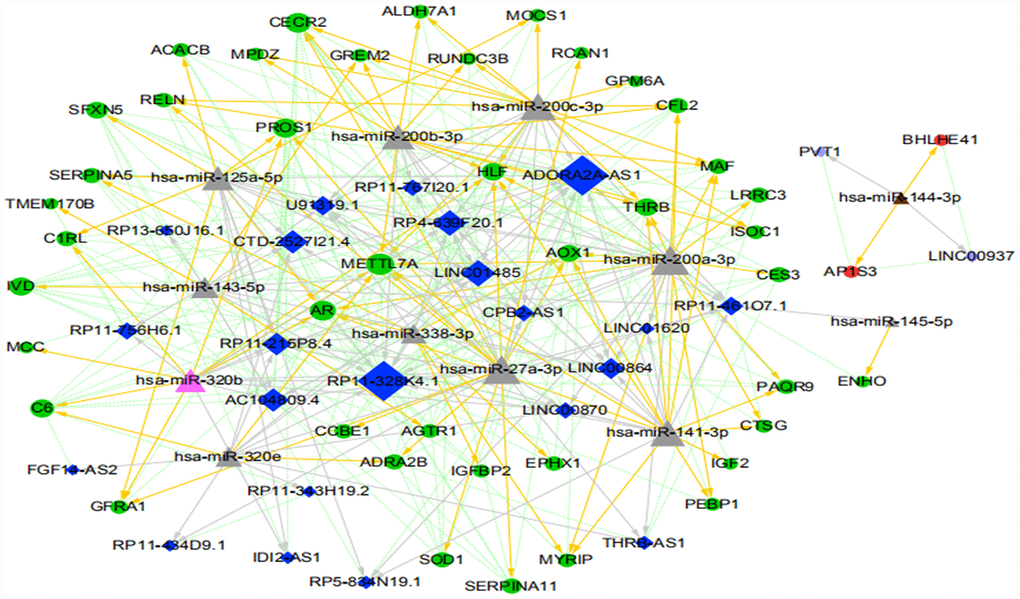 Cytoscape 3.4.0 was used to construct a ceRNA network for the 340 lncRNA-miRNA-mRNA regulatory relationships obtained above. We also determined the upregulation and downregulation of these nodes (some results are shown in Supplementary Table 18). The ceRNA network is shown in Figure 10.
