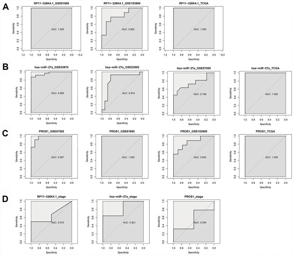 Receiver Operating Characteristic (ROC) analysis of RP11-328K4.1, hsa-miR-27a-3p and PROS1