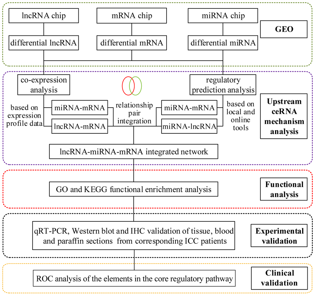 In this study, to determine the diagnostic, therapeutic, and prognostic value of lncRNA-related ceRNETs and their key role in the pathogenesis and progression of ICC, we performed integrated analysis of expression profile data on ICC-related lncRNA, miRNA and mRNA from National Center for Biotechnology Information Gene Expression Omnibus (NCBI GEO). Afterwards, we integrated these identified differential expression (DE) RNAs and constructed a lncRNA-miRNA-mRNA regulatory network. Moreover, functional enrichment analysis was performed on mRNA involved in ceRNET construction. Then, based on the ranking of each ceRNA in ceRNETs (including connectivity and log-fold change, logFC), their relationships (whether their direction of expression changes is consistent or opposite), and their mention in the results of previous studies in other tumors, we identified the most related core regulatory pathways of ICC. Finally, we experimentally validated the mRNA and corresponding protein in the core ceRNET regulatory pathway with ICC fresh tissues, blood, and paraffin sections. We also clinically validated the RNAs in the core ceRNET regulatory pathway with datasets from the NCBI GEO and TCGA. In combination with experimental results, clinical outcomes, and previous research, the mechanism of these noncoding RNAs and their constituent pathways in ICC was further discussed.