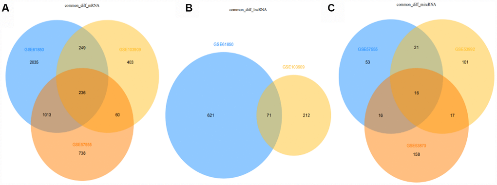 The intersection of DE mRNAs, DE lncRNAs, and DE miRNAs obtained from each dataset is shown in the Venn diagram (http://bioinformatics.psb.ugent.be/Webtools/Venn/).