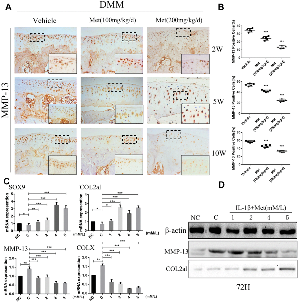 We next analyzed the mechanism of metformin on cartilage matrix degradation and synthesis. Matrix metalloproteinase-13 (MMP-13) and matrix metalloproteinase-3 (MMP-3), which are widely studied in OA, play a crucial role in cartilage ECM degradation. Immunohistochemical analysis showed that the proportion of MMP-13-positive cells was significantly lower in metformin-treated mice compared with controls, especially at 10 weeks after DMM surgery (Figure 2A, 2B), and the MMP-3 had the same expression trend by immunofluorescence staining (Supplementary Figure 3A, 3B). To investigate the role of metformin during chondrogenesis, neonatal mouse primary chondrocytes were obtained and induced with IL-1β (10 ng/mL) for 24 h, and then co-cultured with different concentrations of metformin (1, 2, 4, and 5 mM) for 24 h, 48 h, and 72 h. Gene expression data indicated that as the concentration of metformin increased, the expressions of cartilage matrix degrading protein, such as COLX and MMP-13, were reduced, while the chondrogenic markers, SOX9 and Col2a1, were significantly increased (Figure 2C; Supplementary Figure 2A–2D). The expression of MMP13, MMP-3 and Col2a1 were confirmed by western blotting in primary chondrocytes (Figure 2D; Supplementary Figure 3C). Taken together, these results indicated that metformin decreased expressions of MMP-13, MMP-3 and ColX, and induced expressions of Col2a1 and SOX9, which led to reduced cartilage ECM degradation and promotion of chondrocytes synthesis.